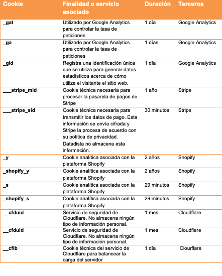 A continuación detallamos las cookies utilizadas en nuestra web y la finalidad de las mismas.