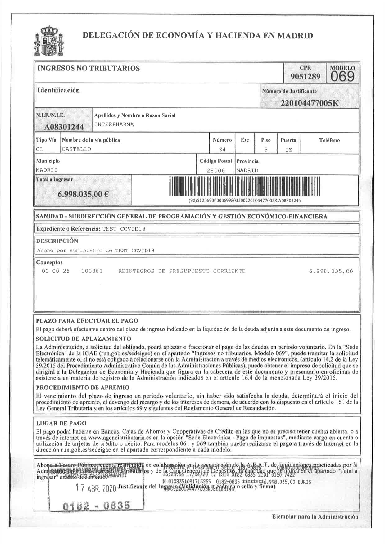 El expediente tramitado mediante procedimiento de emergencia con la empresa INTER PHARMA S.A consistía en la adquisición de 659.000 kits diagnósticos para el COVID-19 de la empresa china BIOEASY por un precio 17.143.885 euros. Sanidad adelantó en tres facturas un total de 6.998.035 euros que han sido devueltos el pasado 17 de abril de 2020.