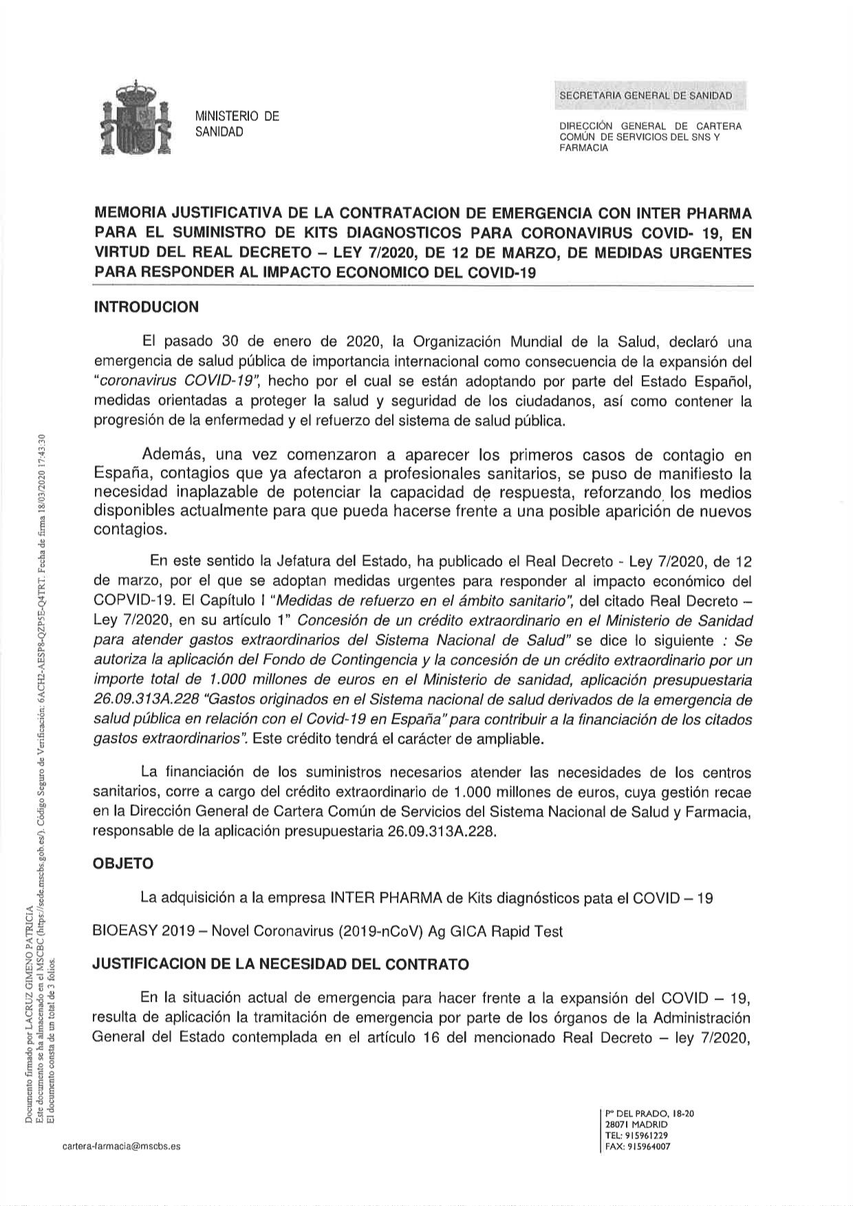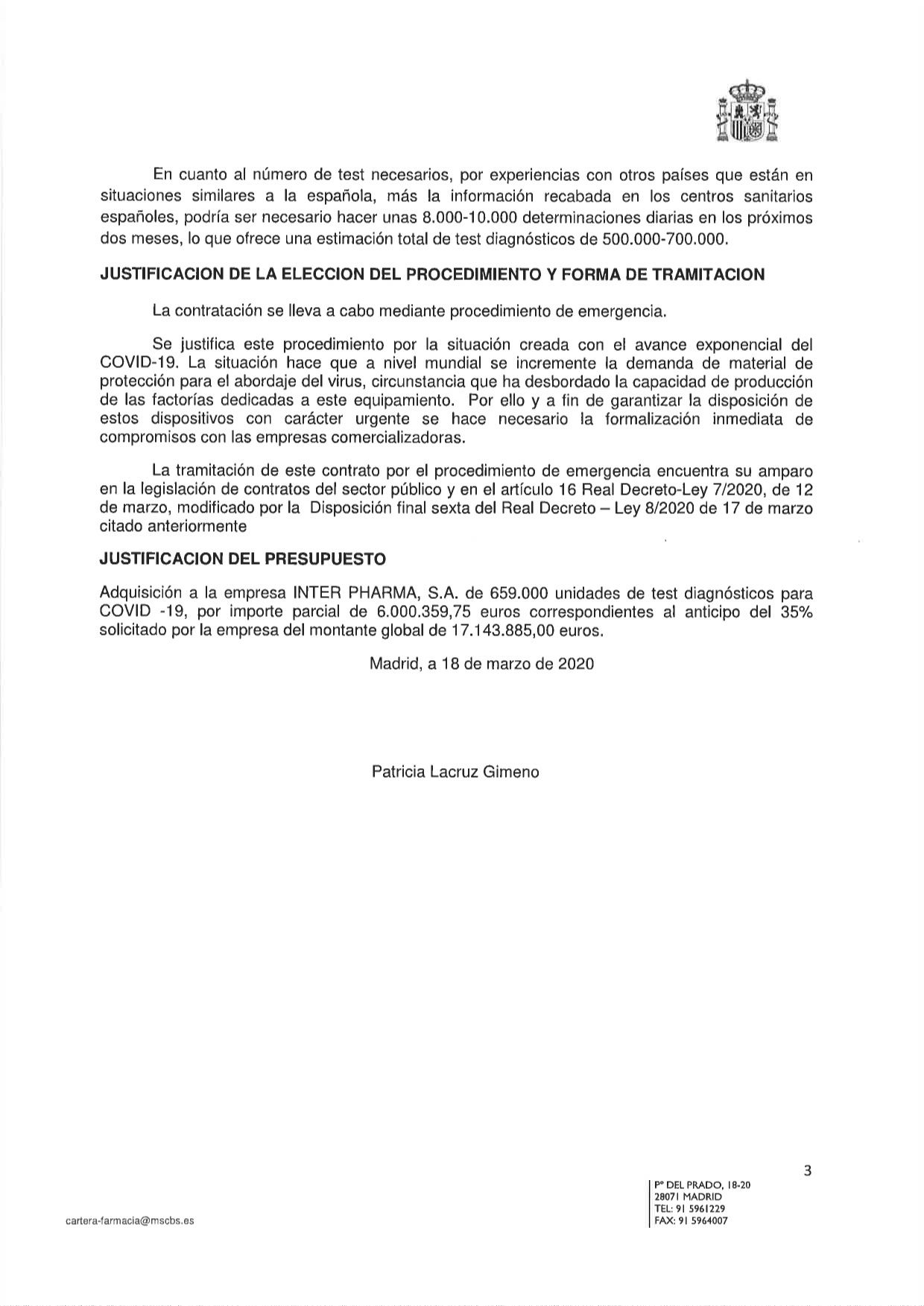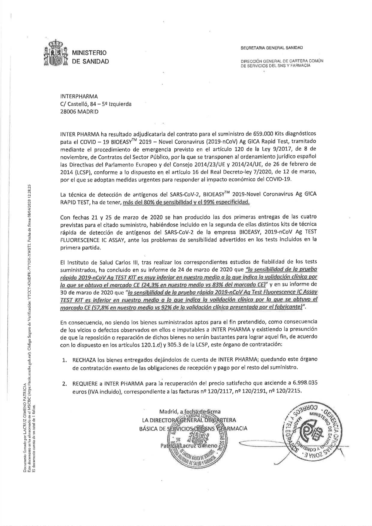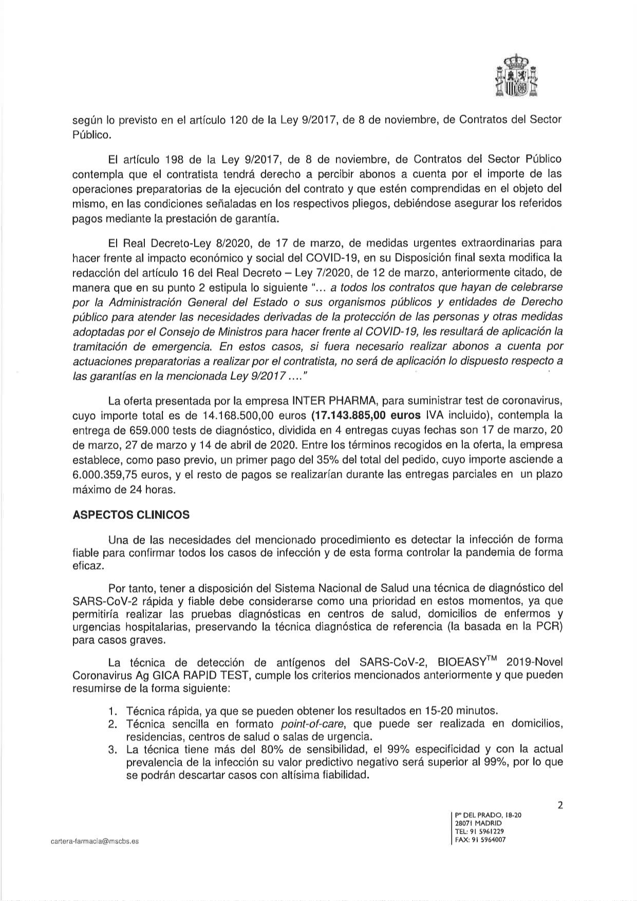 El Ministerio de Sanidad ha publicado hoy en la plataforma de Contratación del Estado todos los expedientes de suministros de emergencia por enfermedad COVID-19. Uno de los contratos es el del proveedor cuyos test kits diagnósticos han sido devueltos debido a que su fiabilidad era inferior a la marcada.