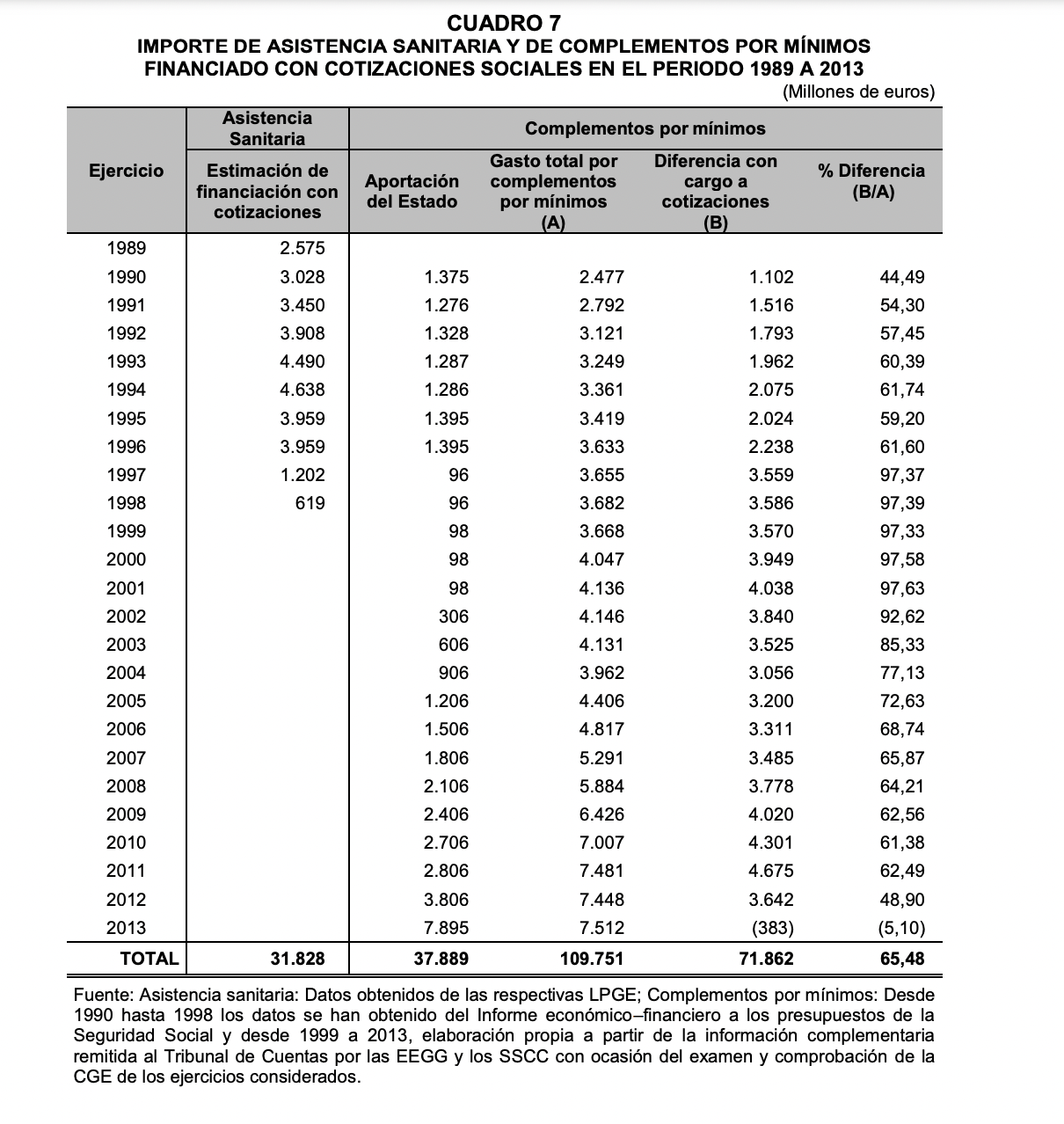 Incluso el complemento a mínimos, una de las partidas importantes del presupuesto gestionado por la Seguridad Social, se tardó muchísimo (25 años) en transferir completamente a la cuenta del cajón de los impuestos generales. El Tribunal de Cuentas hizo público un informe en 2020 afeando que "esta demora ha causado un serio perjuicio al sistema, ya que ha tenido que soportar con cargo a cotizaciones sociales un importe estimado en, al menos, 103.690 millones de euros, siendo en parte responsable de la situación de endeudamiento y de las tensiones de liquidez que han afectado y afectan a la Seguridad Social".