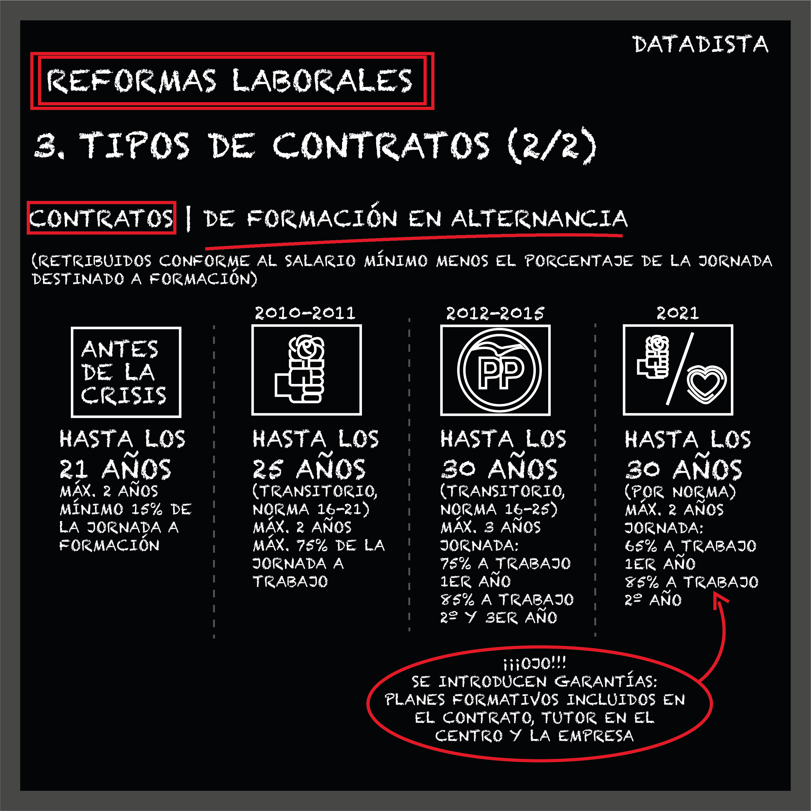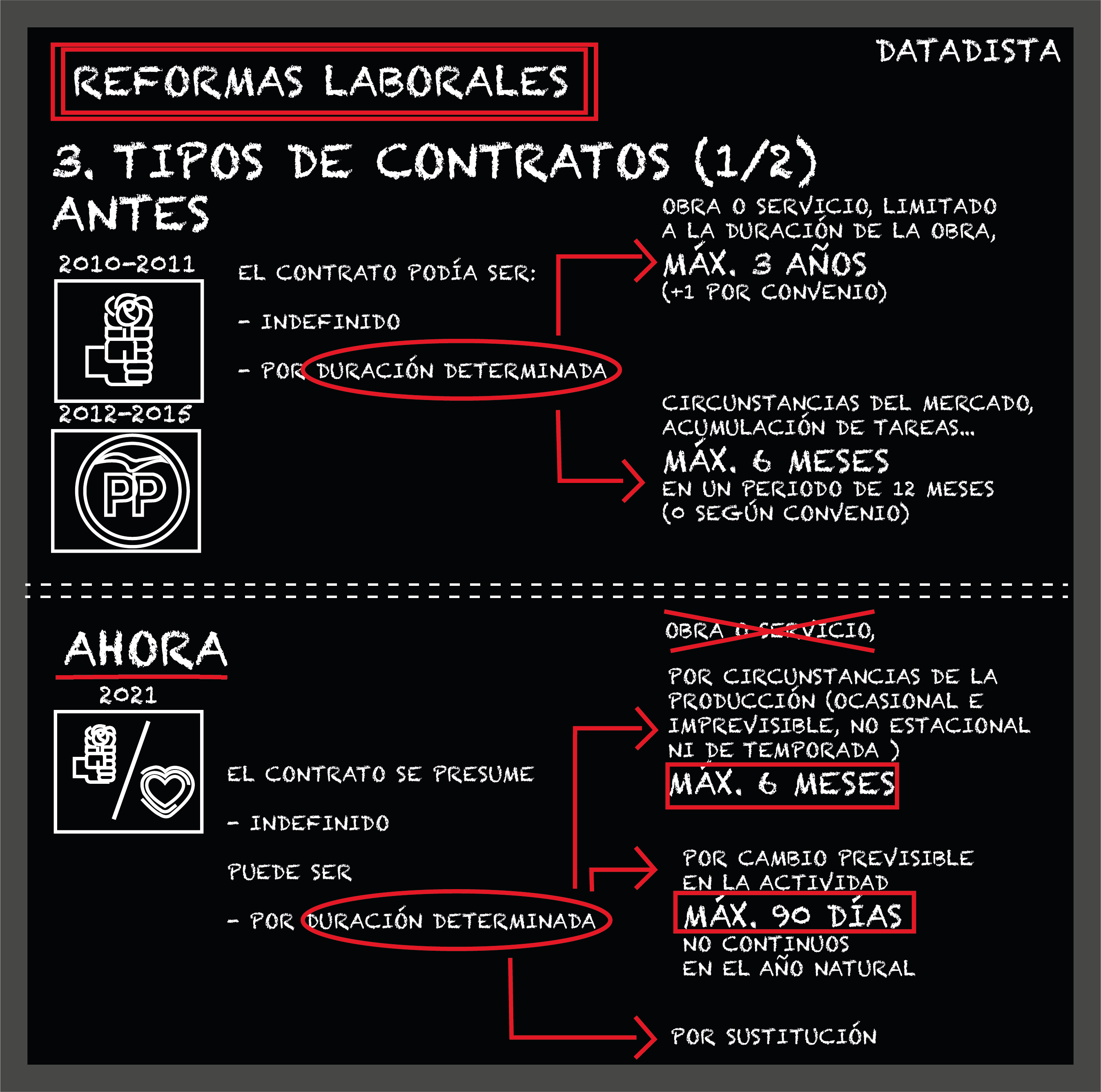 Donde está el gran cambio es en las modalidades de contratación. Es ahí donde el Gobierno ha puesto toda la esperanza para lograr acabar con esa foto de la que tanto te hemos hablado en DATADISTA que muestra cómo en España se crea empleo neto los lunes, se destruye los viernes, crece con fuerza el primer día de cada mes y parece una hecatombe el último. Hasta el día siguiente.
