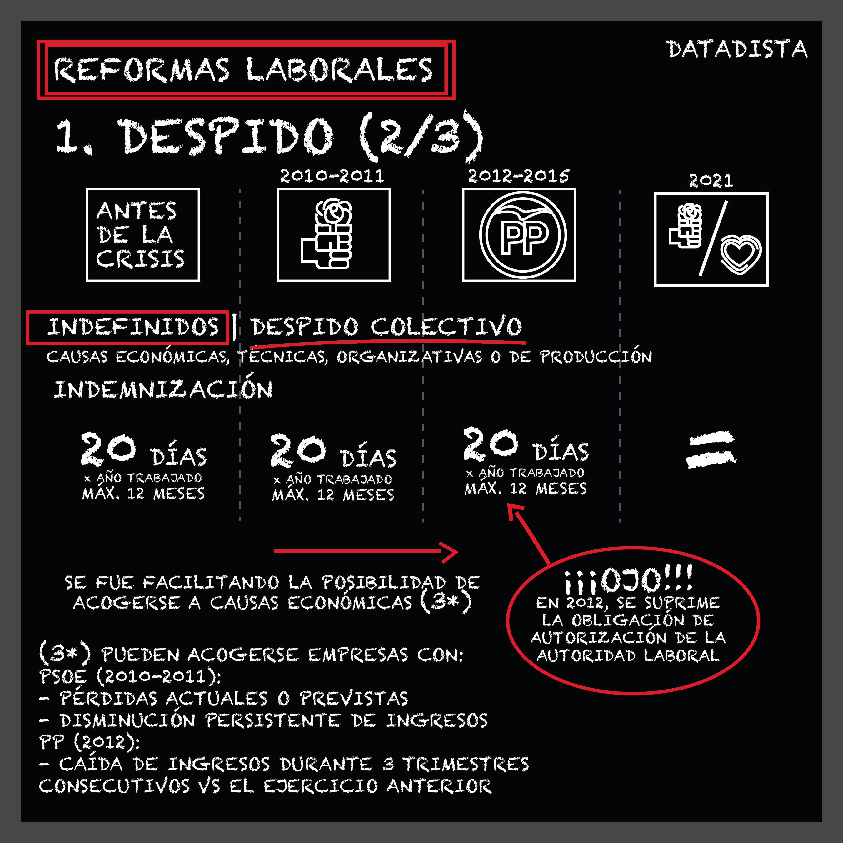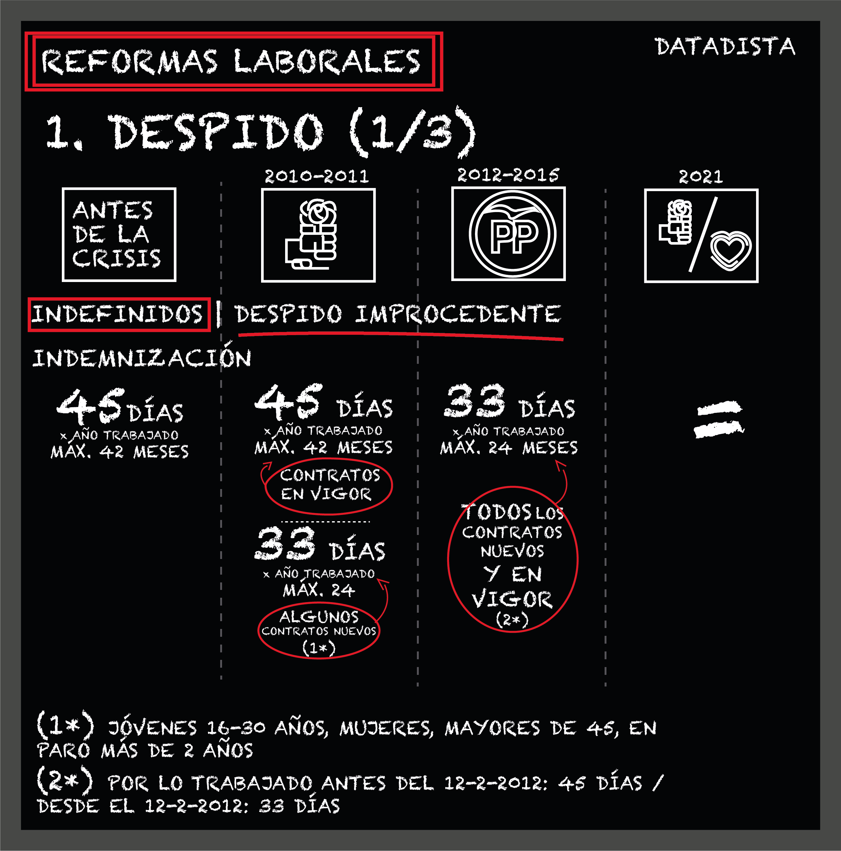 En temas de despido no ha habido grandes cambios. La indemnización por despido improcedente de 33 días por año trabajado en contratos indefinidos fue introducida por el PSOE de Rodríguez Zapatero a través de lo que se llamó contrato para el fomento de la contratación indefinida, hoy más que derogado. Aquel contrato acabó extendiéndose a tantos supuestos que casi se generalizó pero solo afectaba a contratos nuevos, en ningún caso a los que estaban en vigor.
