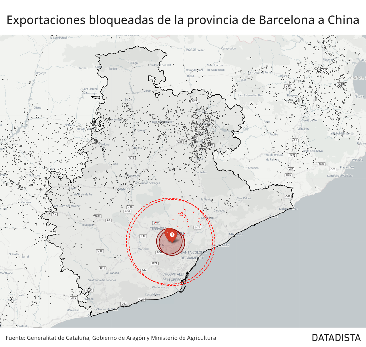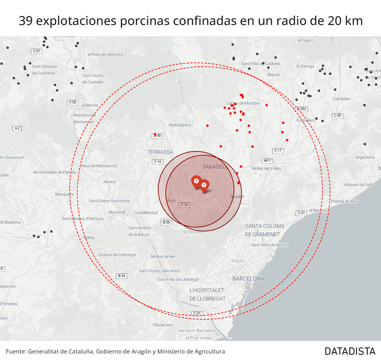 Más allá de la sacudida comercial en las exportaciones, que tendrá un impacto económico en el sector durante meses, la clave de este brote reside en el lugar donde ha ocurrido. El perímetro de seguridad de veinte kilómetros establecido alrededor de Bellaterra, en el área metropolitana de Barcelona, es una zona de escasa densidad ganadera. El confinamiento afecta a treinta y nueve explotaciones con una capacidad aproximada de diez mil animales. Aunque grave para los afectados, es una cifra manejable dentro del volumen nacional.