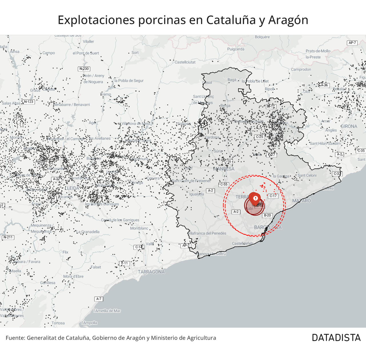 En el término municipal de Bellvís, un radio idéntico de veinte kilómetros habría atrapado más de mil granjas, inmovilizado centenares de miles de animales, según un análisis realizado por DATADISTA. Se ha utilizado un algoritmo de densidad espacial sobre cada una de las más de 5.300 explotaciones porcinas activas en Cataluña para calcular cuántas instalaciones vecinas quedarían confinadas. Esto ha permitido identificar el peor escenario posible o el punto de máxima densidad y contrastarlo con el foco real detectado.