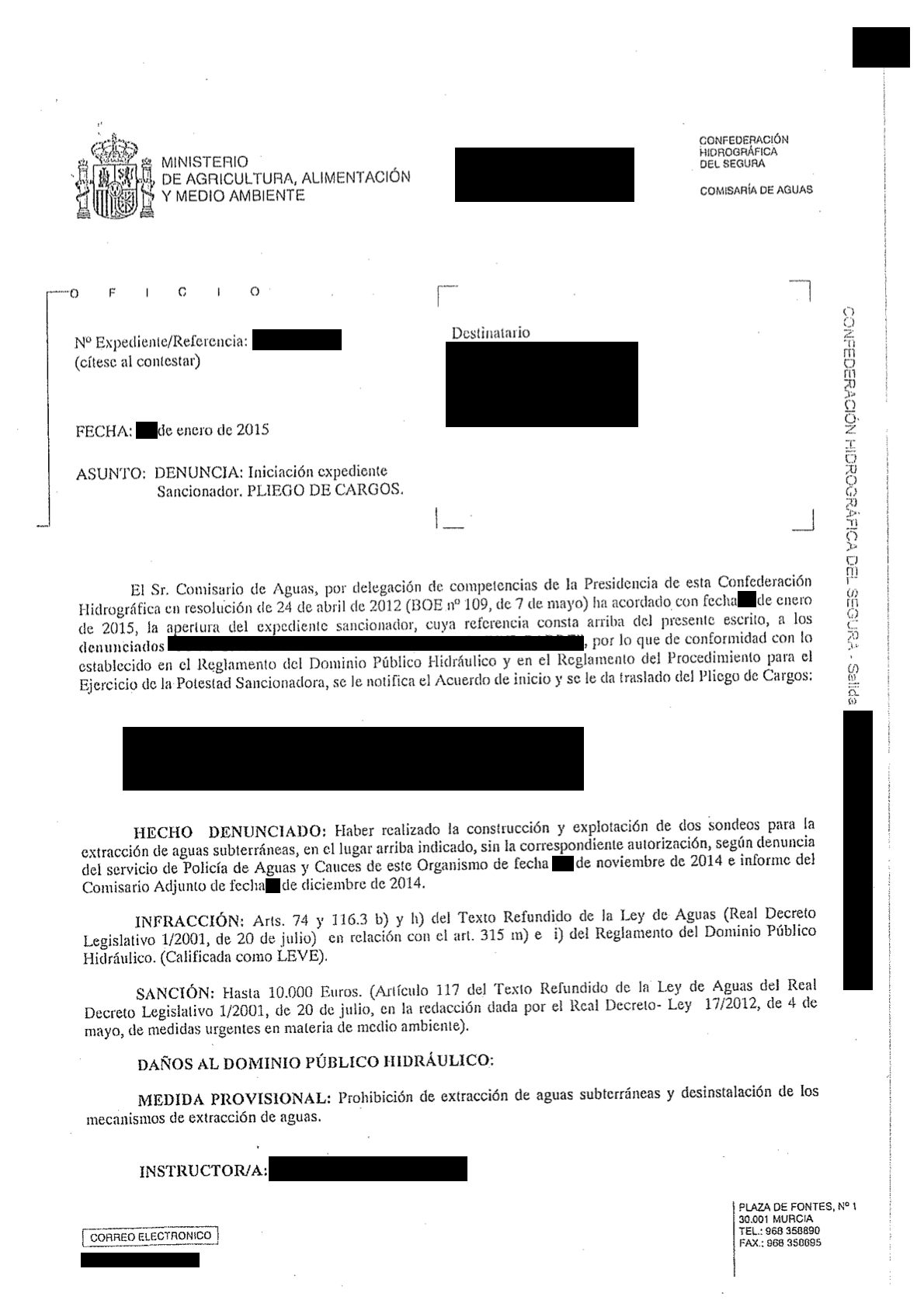 Una resolución que señala que "es de destacar que los acuíferos de la Cuenca del Segura han sido declarados en situación de sobreexplotación". A pesar de ello, la sanción se quedó en 6.000 euros por considerarse infracción leve, "ya que no han sido valorados los daños al dominio público hidráulico, ya que de haber sido así, la infracción podría ser considerada como menos grave, grave o muy grave dependiendo de la cuantía de tales daños".