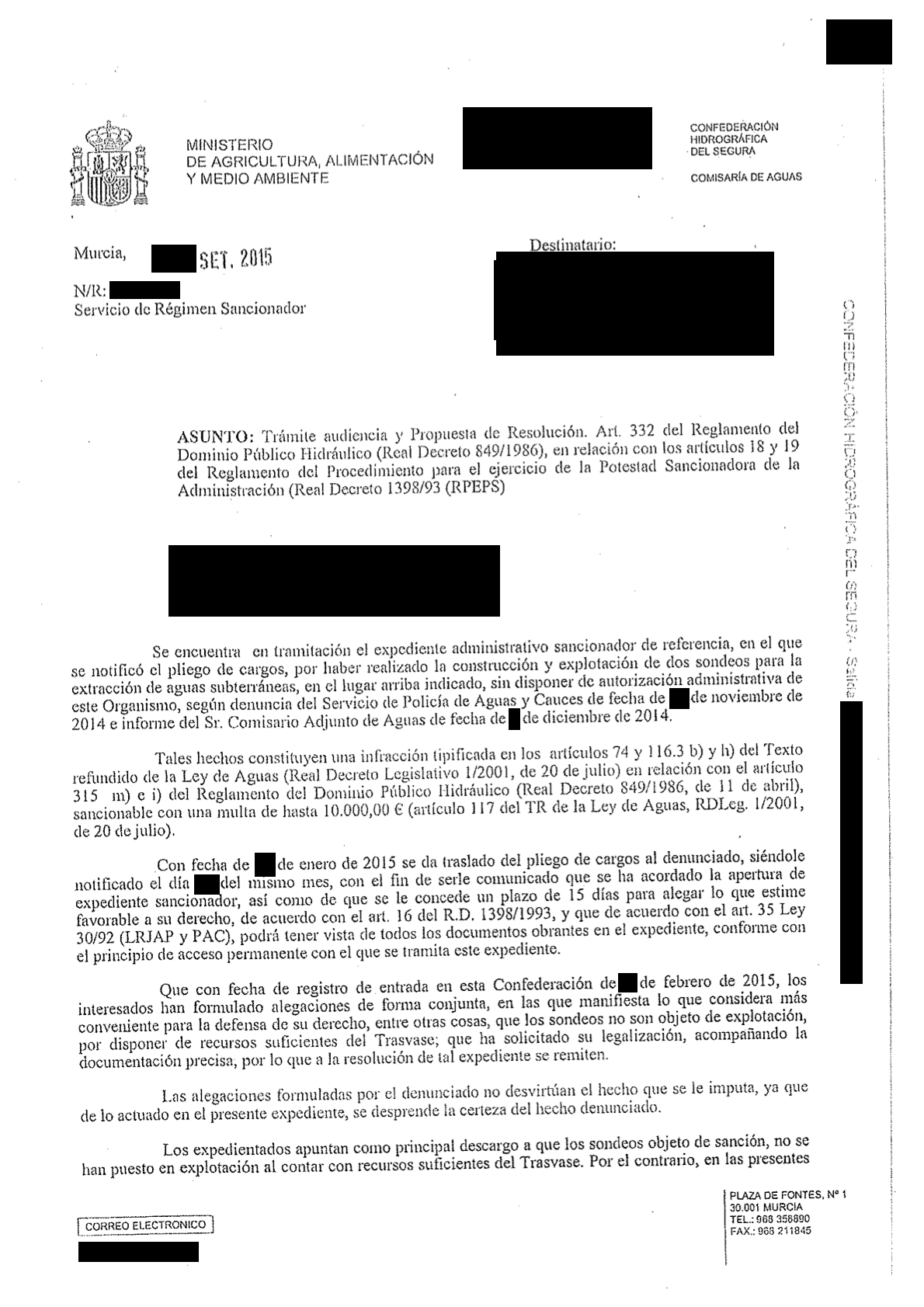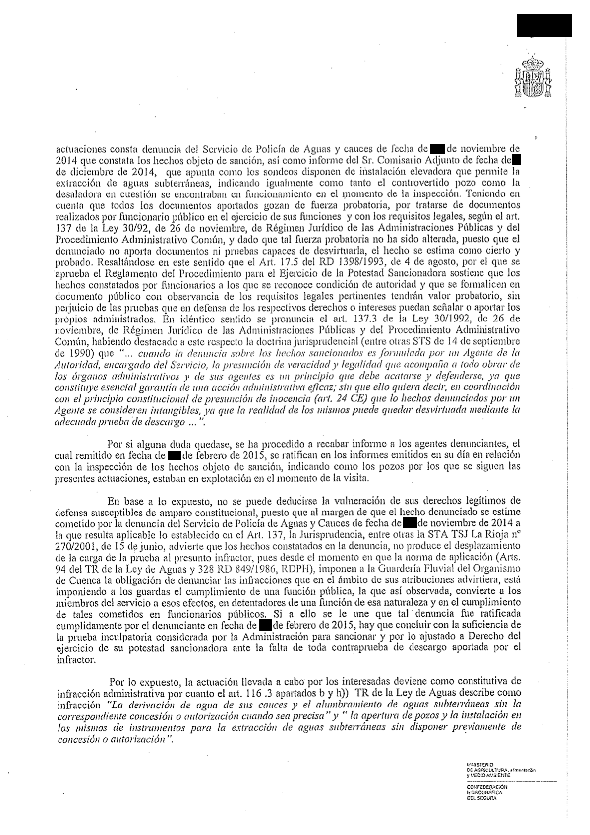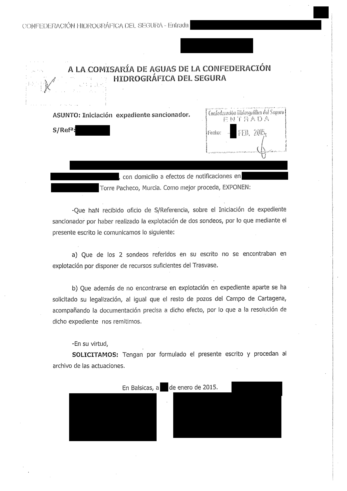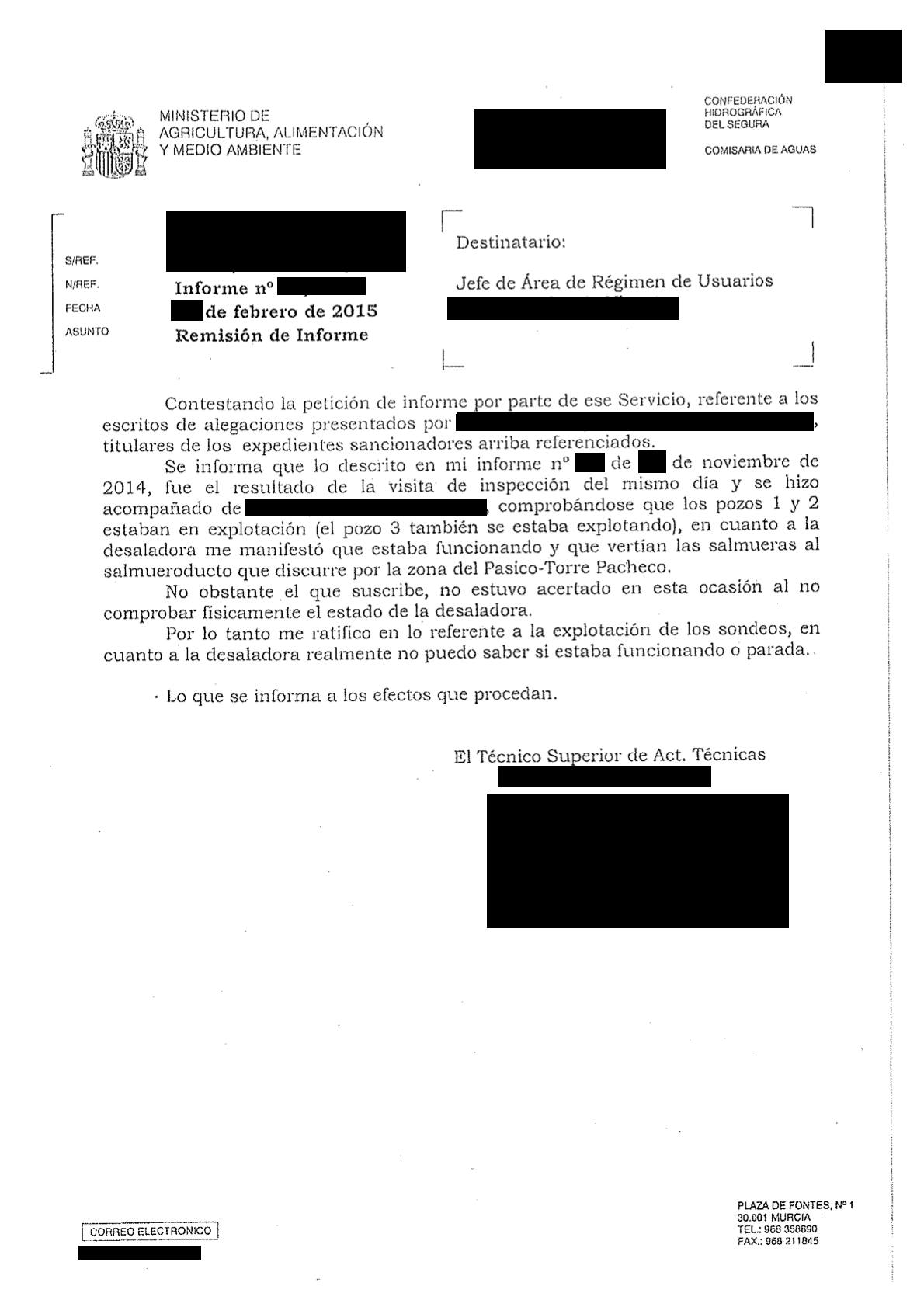 Un mes después llegaban las alegaciones, negando el informe de los agentes y asegurando que los pozos no estaban en explotación en 2013 ni 2014 porque había agua de sobra del Trasvase Tajo-Segura en ese momento. Debido a esta alegación, se procedió solicitar al Jefe de Servicio de la Policía de Aguas que ratificase la información sobre los pozos denunciados y la desaladora que figuraba en el informe de los agentes, lo que tiene lugar el 16 de febrero, cuando se ratifica que el informe emitido el 26 de noviembre de 2014 "fue el resultado de la visita de inspección del mismo día y se hizo acompañado" del denunciado, "comprobándose que los pozos 1 y 2 estaban en explotación (el pozo 3 también se estaba explotando). En cuanto a la desaladora, manifestó (el denunciado) que estaba funcionando y que vertían las salmueras al salmueroducto que discurre por la zona del Pasico-Torre Pacheco". El informe de los agentes y los documentos aportados se consideró que tenían "fuerza probatoria, por tratarse de documentos realizados por funcionario público en el ejercicio de sus funciones", así como que el denunciado no aportó documentos ni pruebas de lo contrario.