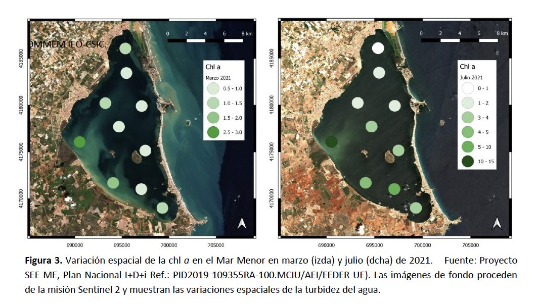 Este año, ese indicador también empezó a avisar con tiempo. "Muestreos adicionales realizados en marzo y julio de 2021 corroboran que en marzo las concentraciones de clorofila ya empezaban a ser algo elevadas, en particular en la costa oeste. El 27 de julio las concentraciones ya alcanzaban valores medios de 12-13 µg/l, muy similares a los alcanzados en anteriores blooms fitoplanctónicos en la laguna, observándose los valores máximos frente a la Rambla del Albujón. Los valores medios más elevados se observaron en la parte central y sur" de la laguna.