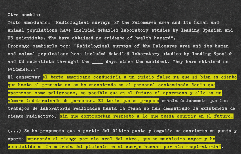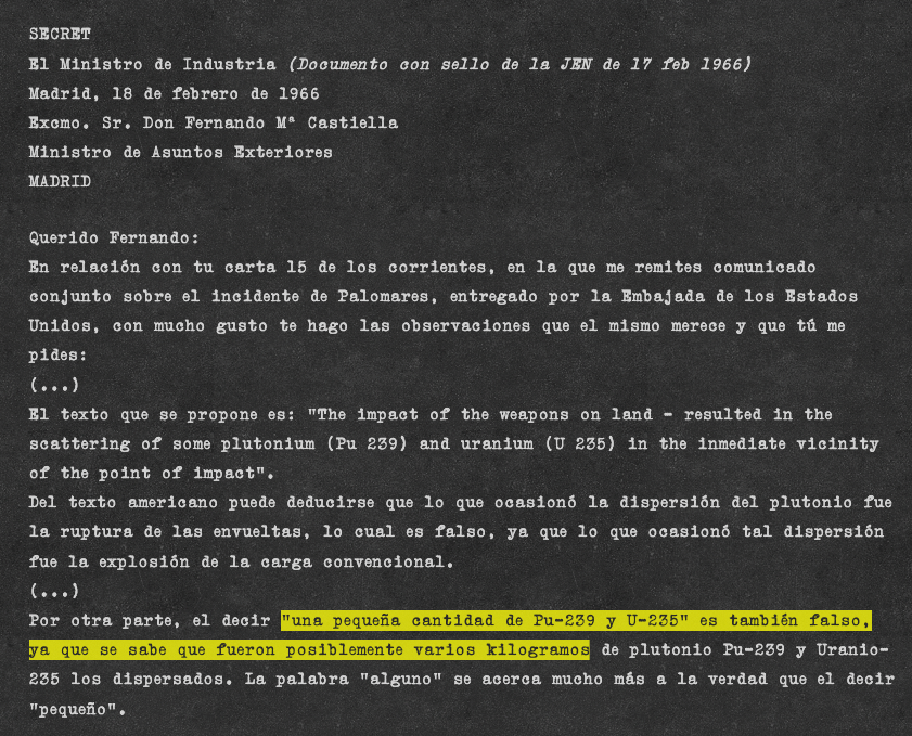 En febrero de 1966, al mes del accidente, el ministro de Asuntos Exteriores español, Fernando María Castiella, le envía al ministro de Industria, Gregorio López-Bravo, un borrador de nota que quieren publicar los estadounidenses. López-Bravo le contesta a Castiella diciendo que ha detectado que los estadounidenses están tratando de eliminar responsabilidades futuras y que, cuando se habla de radiactividad, esto no tiene sentido. Ni es poco el plutonio que ha quedado esparcido por el suelo, ni se saben las consecuencias futuras para la salud ni a cuántas personas puede llegar a afectar, ni se puede hablar de bajo riesgo mientras exista el riesgo de inhalación, que es el que se sabe que reparte más papeletas para desarrollar cáncer. Este es el texto literal de la respuesta de López-Bravo.