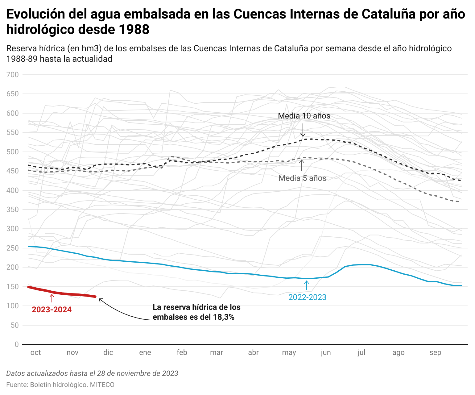 En este gráfico puedes ver la evolución del agua embalsada en las Cuencas Internas de Cataluña. Esta semana estaban al 18,3% de su capacidad total con 124 hm³.