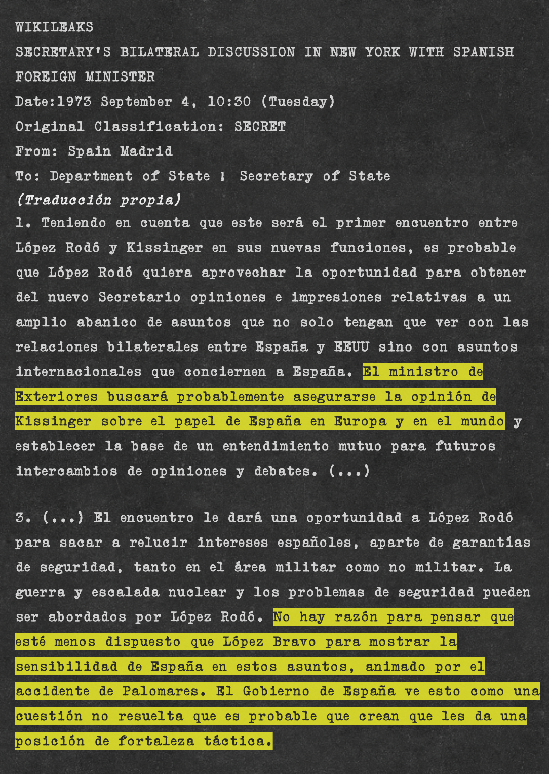 En 1973, López-Bravo es sustituido al frente de Asuntos Exteriores por Laureano López Rodó. El 4 de septiembre de 1973, el embajador estadounidense en Madrid envía un cable al Departamento de Estado de EEUU, desvelado por Wikileaks, relativo a los temas que prevé que va a querer tratar el nuevo ministro de Asuntos Exteriores español en un encuentro previsto con Kissinger. Entre esos temas está, intuye el embajador, la posible pretensión de arrancar de los americanos garantías sobre seguridad en relación con las cuatro bases militares que tienen sobre suelo español. Es previsible, comenta el cable, que López Rodó sienta que el accidente de Palomares, “que el Gobierno de España considera una cuestión no resuelta”, le confiere “fortaleza táctica” en la negociación. Así lo ha mostrado ya su predecesor, López-Bravo.