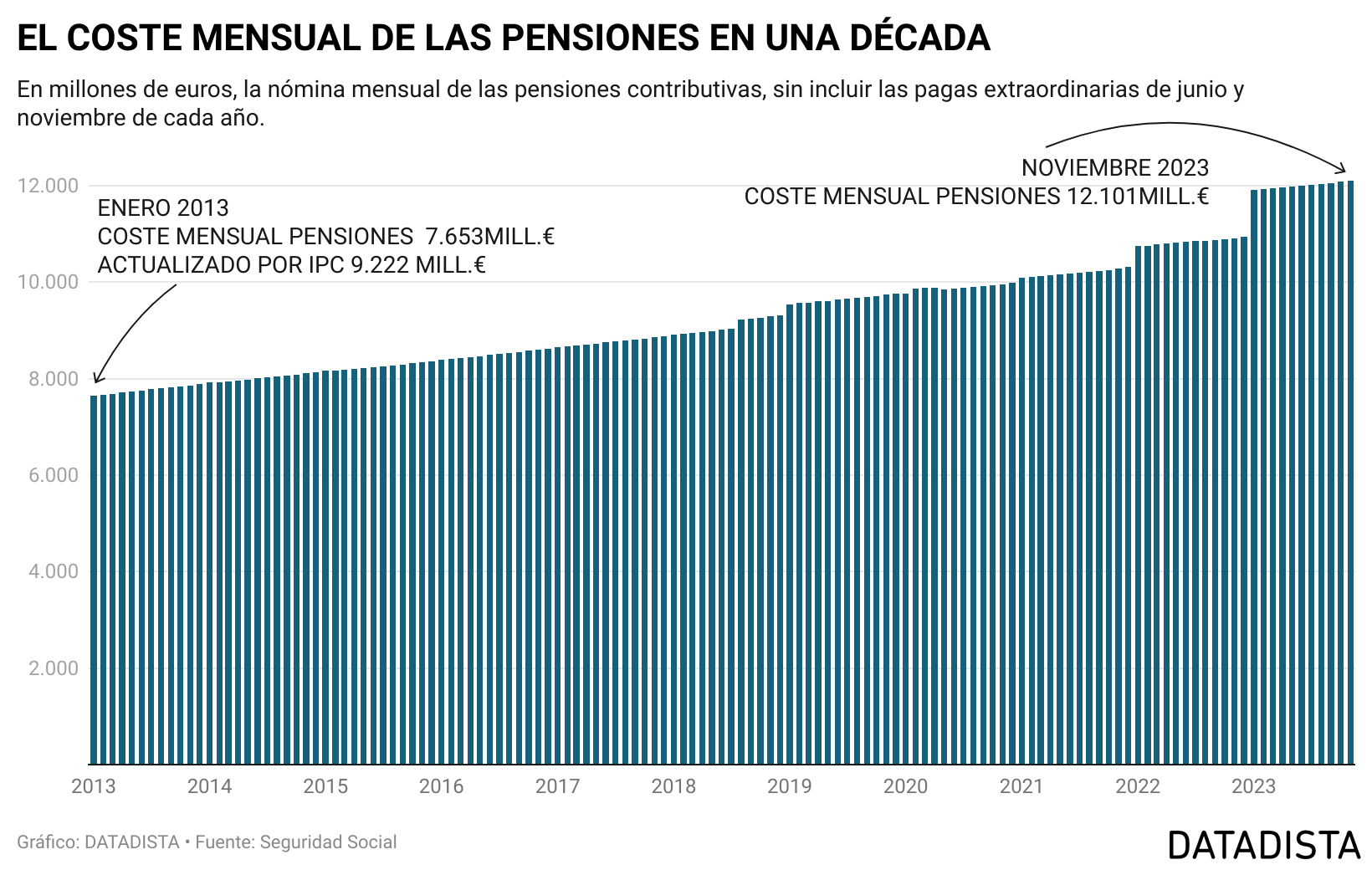 Hoy te traemos una estadística que lleva décadas generando polémica: el coste de las pensiones y la capacidad del sistema de ser sostenible. La nómina de noviembre de 2023, que incluye el abono de la paga extraordinaria, se ha elevado a 23.923 millones de euros. Es el resultado de añadir a los 12.101 millones del pago ordinario mensual los 11.823 millones de euros que ha supuesto la paga extra.