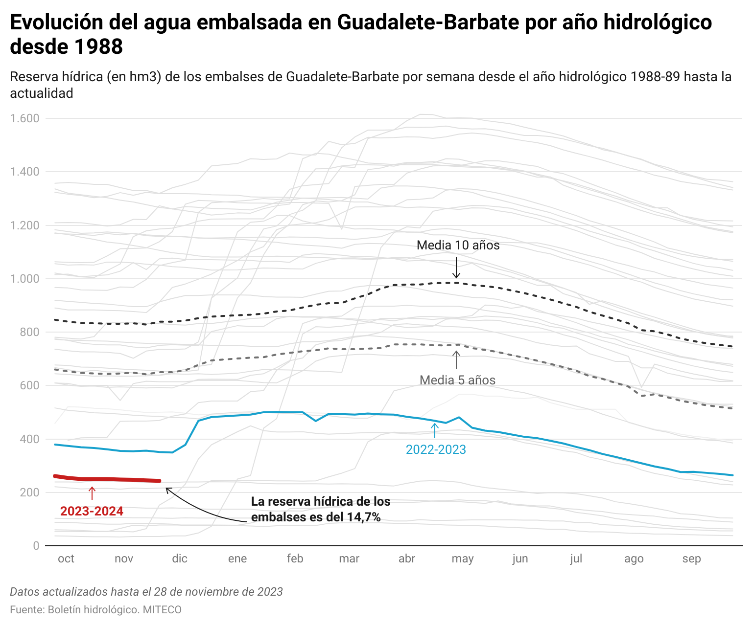 En el siguiente gráfico se muestra la situación de los embalses que abastecen a buena parte de la provincia de Cádiz. Actualmente se encuentran al 14,7% de su capacidad total con 243 hm³.