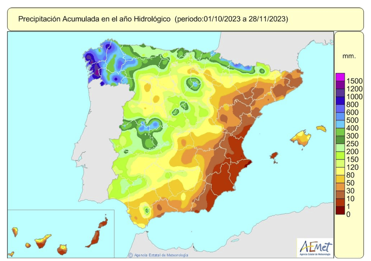 La Agencia Estatal de Meteorología (AEMET) indica que el otoño de 2023 probablemente será uno de los tres más cálidos en la serie histórica, así como uno de los más lluviosos, superando los valores normales. Entre el 1 de octubre y el 29 de noviembre, las precipitaciones acumuladas alcanzaron los 154 mm, un 4% por encima del promedio habitual. Sin embargo, esta media elevada se debe a las intensas lluvias caídas durante el otoño en el noroeste del país, mientras que en el tercio este de la Península las precipitaciones han sido inferiores a lo normal. De Almería a Girona ha llovido muy poco. Lo puedes ver en este mapa de la AEMET que muestra la situación desde el 1 de octubre de 2023.