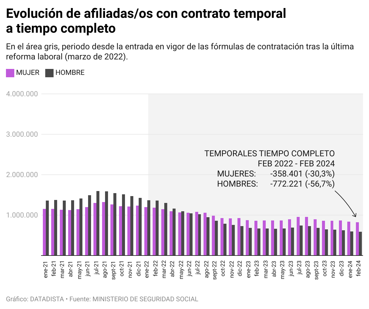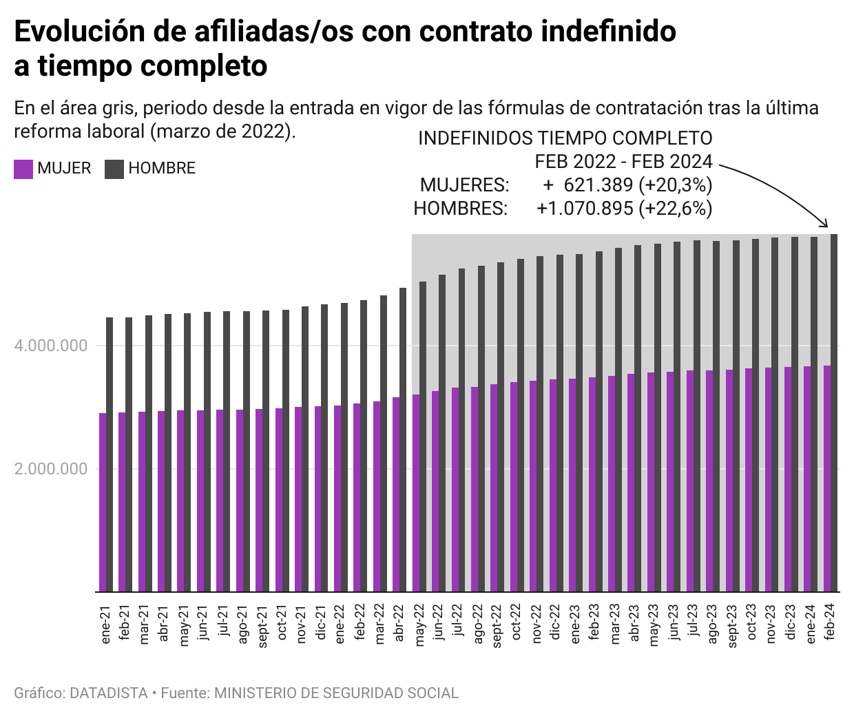 En números absolutos son los hombres los más beneficiados, puesto que hay actualmente 1.070.000 afiliados más con este tipo de contrato con respecto a febrero de 2022, frente a 621.000 mujeres más. Teniendo en cuenta que antes de la reforma seis de cada diez puestos indefinidos a tiempo completo ya estaban ocupados por hombres, llama la atención que tras la misma incluso hayan ganado algo de peso en el total (61,2%).
