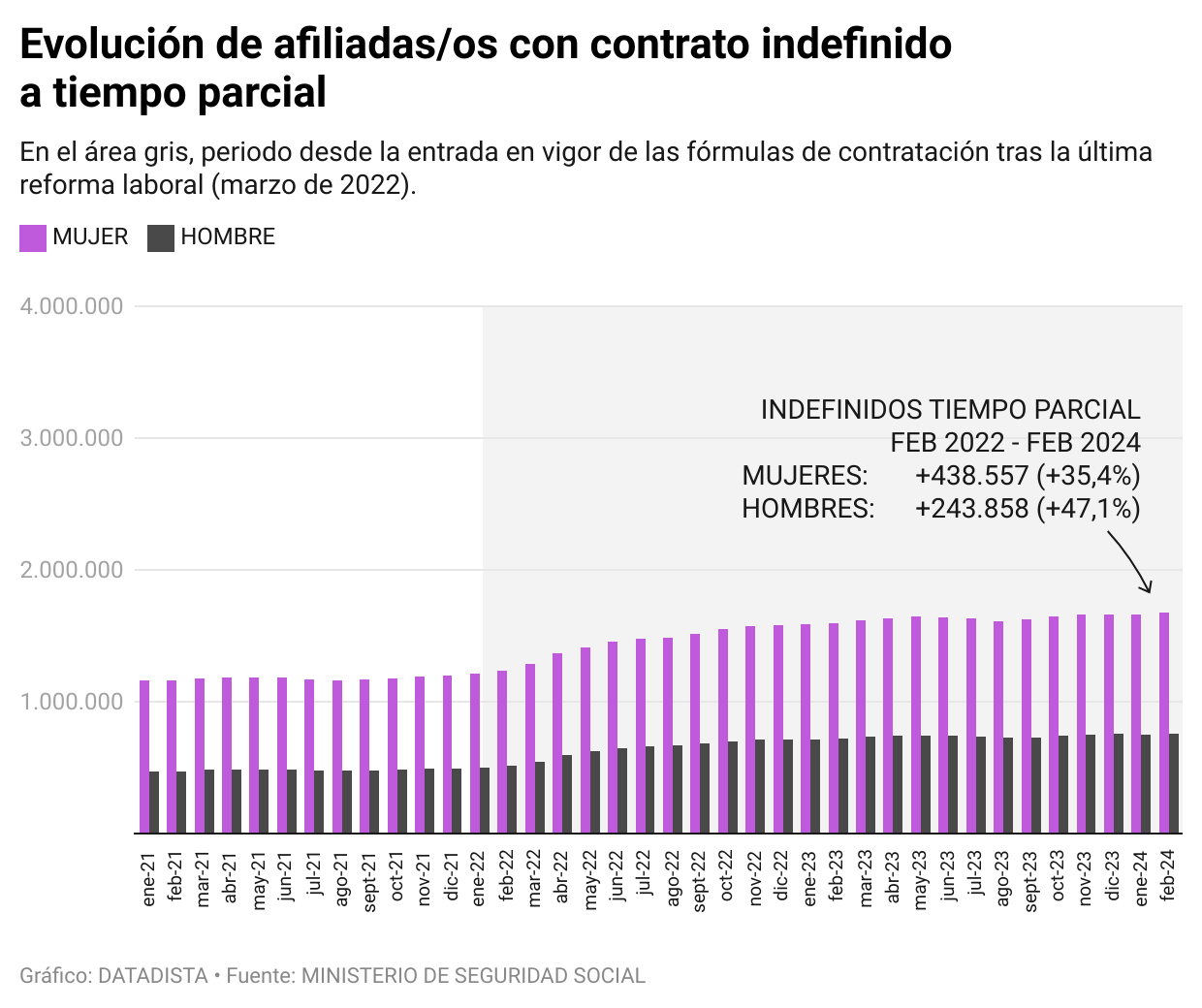 En los contratos indefinidos a tiempo parcial, la imagen es muy diferente. Estando ocupados mayoritariamente por mujeres, la afiliación femenina es la que más ha crecido en términos absolutos en este tipo de contratación en los últimos dos años (+438.557), aunque en cifras porcentuales son los contratos de hombres los que más han aumentado. Algo similar ocurre con los fijos discontinuos, si ya llevaban nombre de mujer, con el fuerte impulso que han recibido con la reforma es en los contratos femeninos donde más aumenta la afiliación en términos absolutos.
