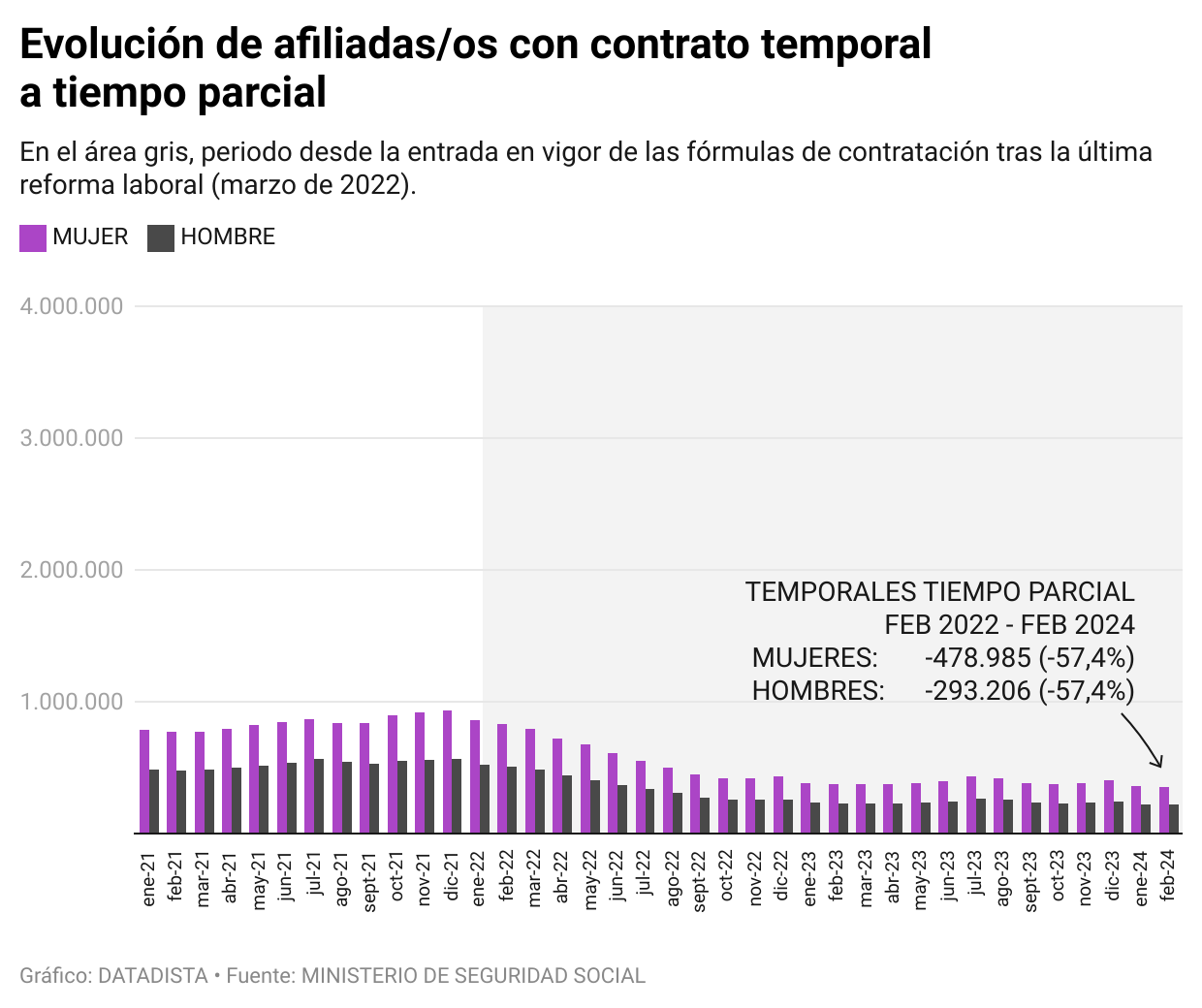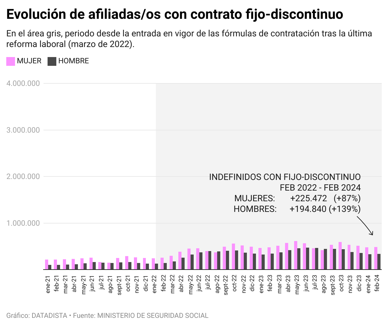 La reforma laboral trajo un cambio profundo en las modalidades de contratación de este país, suprimiendo el contrato de obra y servicio y limitando a causas muy tasadas la posibilidad de realizar contratos temporales. Puedes ver aquí una sencilla explicación de los cambios. La marcha de la economía ha permitido que aumente la afiliación hasta niveles históricos. Hay casi 1.040.000 personas más que las que había afiliadas en el último febrero antes de la entrada en vigor de la reforma laboral, hace dos años, en marzo de 2022. La calidad es mayor. El empleo indefinido ha aumentado con fuerza en todos los casos y no por la manoseada polémica de los fijos discontinuos, de la que ya hemos hablado muchas veces, pero tampoco ha habido un beneficio mayor para las mujeres como el Gobierno suele destacar.
