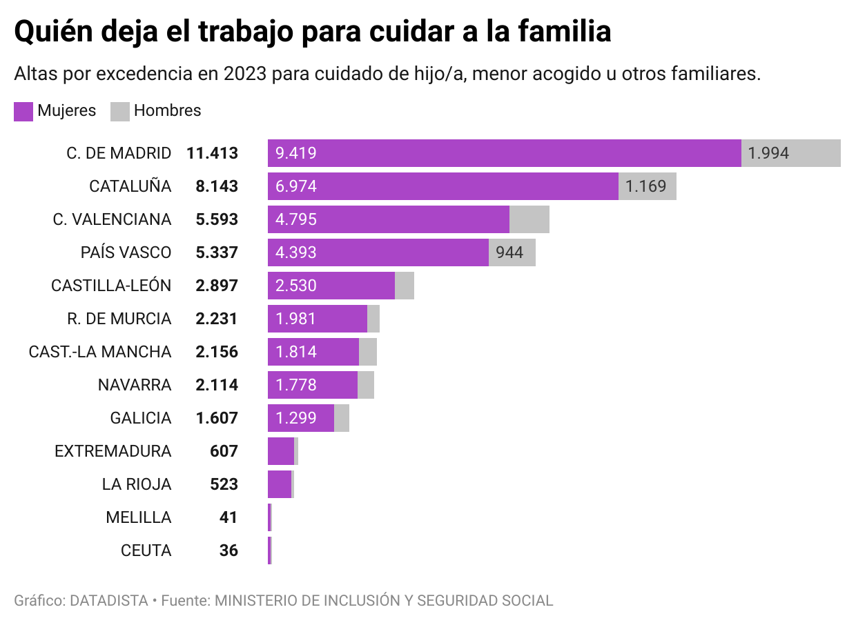 Por otro lado, son las mujeres quienes están llevando la carga mayor en los cuidados y esto explica parte de lo que ocurre con la contratación. También el tipo de trabajo. Nos parece relevante recordar hoy un gráfico que te mostrábamos hace unas semanas y que deja claro quién incluso renuncia temporalmente a su puesto de trabajo cuando se necesita cuidar a alguien en la familia, sea un hijo y otro familiar.