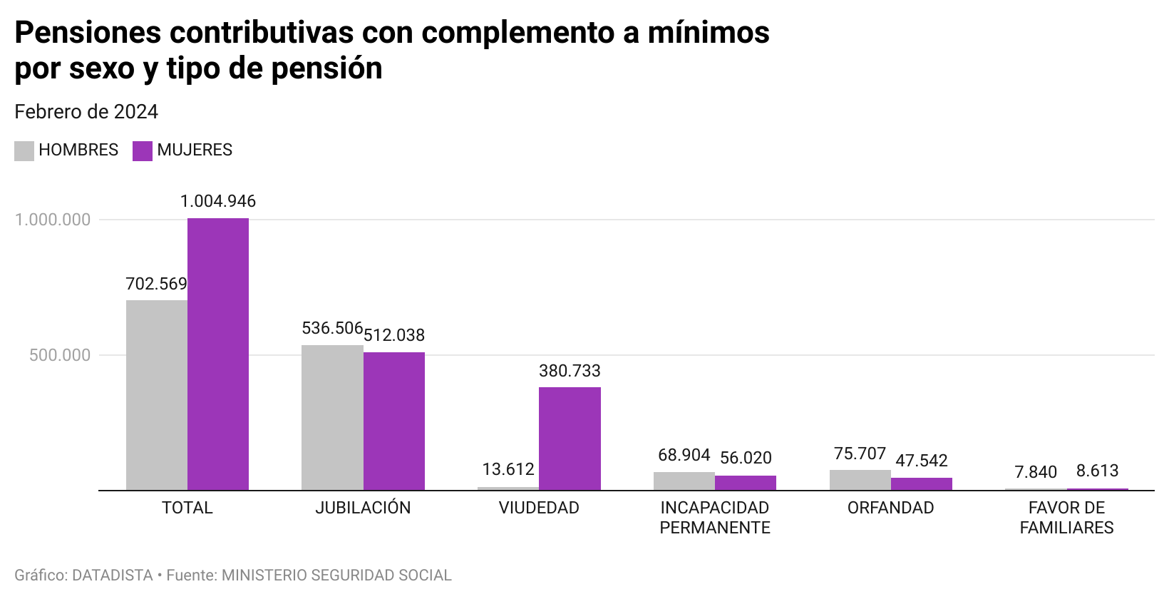 Los empleos, salarios, excedencias y tipos de contrato de hoy son las pensiones de mañana y lo que parece claro es que la incorporación masiva de la mujer al mercado laboral no va a traer el cambio en la foto de las pensiones contributivas al nivel que se podría esperar. De las mujeres en edad de trabajar de ayer, sale ya hoy la siguiente imagen, que muestra quiénes están hoy por hoy cobrando una pensión con complemento a mínimos, es decir, que a pesar de haber cotizado los 15 años mínimos que exige la Seguridad Social para tener derecho a una pensión contributiva, no llegan al mínimo establecido y el Estado se lo complementa. Sí es importante destacar que hoy por hoy buena parte de las pensiones de las mujeres con complemento a mínimos no lo son por lo que cotizaron ellas sino sus maridos por ser pensiones de viudedad.