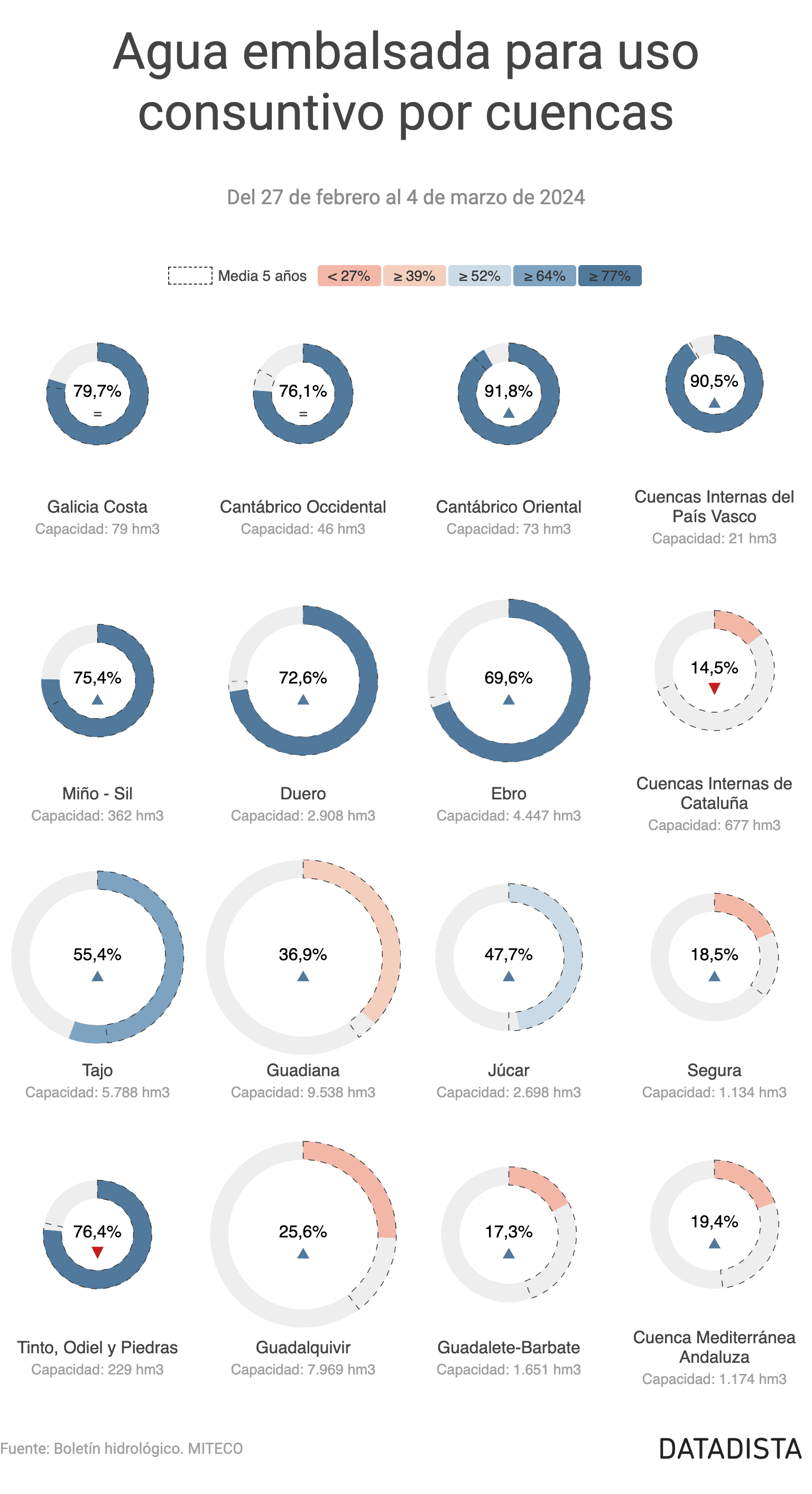 En este gráfico, puedes ver de un vistazo la situación del agua embalsada para uso consuntivo por cuencas y su comparación con la media de los últimos cinco años.