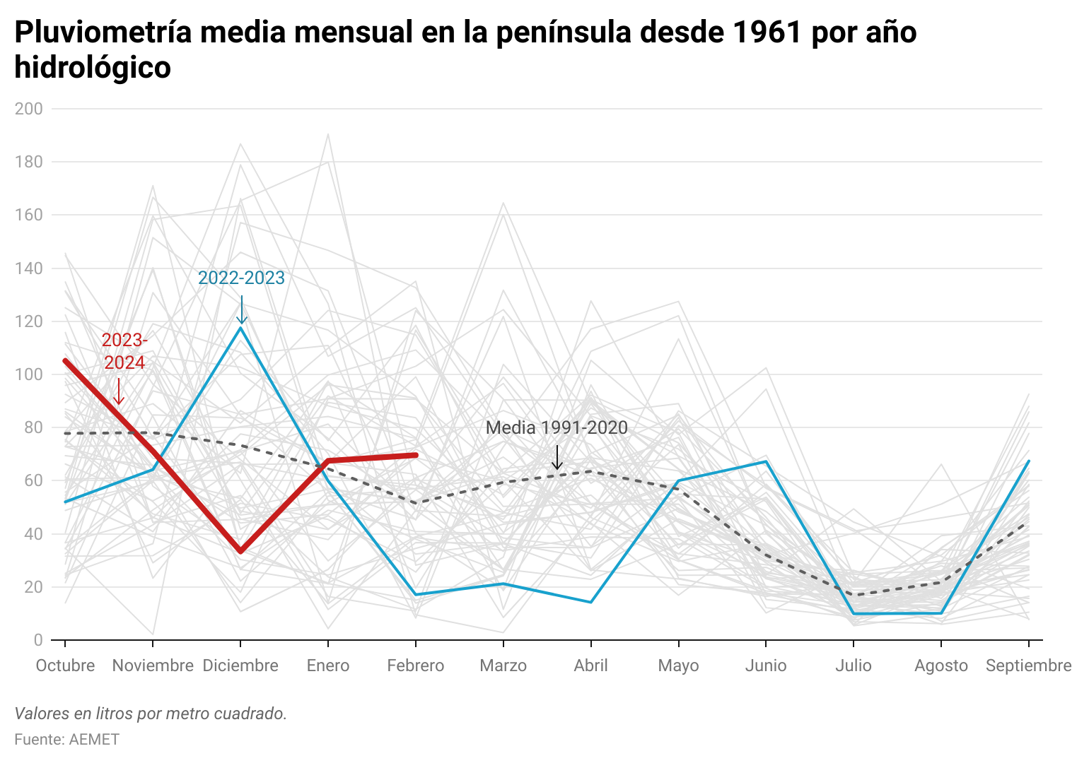 El problema es que se requiere una primavera significativamente más lluviosa de lo normal para que muchas cuencas puedan empezar a salir de la situación de sequía, dado que las precipitaciones caídas en febrero han sido muy escasas en todo el Levante peninsular. Los embalses de uso consuntivo se encuentran 7,5 puntos por debajo de la media de los últimos cinco años, situada en 19.127 hm³.