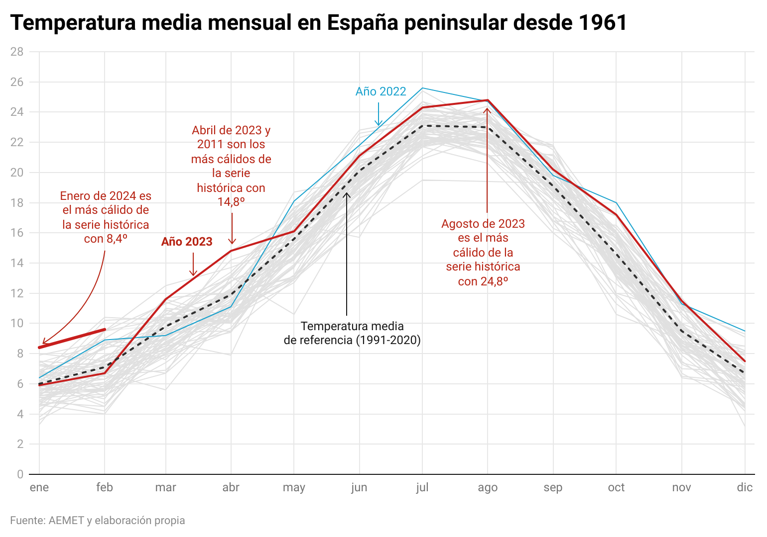 Esta semana, la Agencia Estatal de Meteorología (AEMET) publicó el balance climático para el mes pasado, señalando que febrero fue un mes muy cálido, con una temperatura media en la España peninsular de 9,6 °C, lo que supone un valor 2,5 °C por encima de la media. En el gráfico adjunto, se puede ver la evolución de la temperatura media mensual en la España peninsular desde 1961.