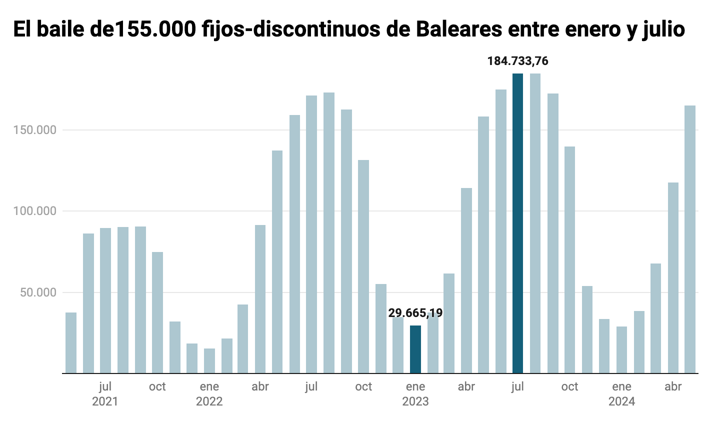 Si miramos exclusivamente los fijos discontinuos de Baleares, su evolución desde la entrada en vigor de la última reforma laboral es la siguiente, llegando a una oscilación de 155.000 afiliados y afiliadas de diferencia entre el mes de enero y el de julio.