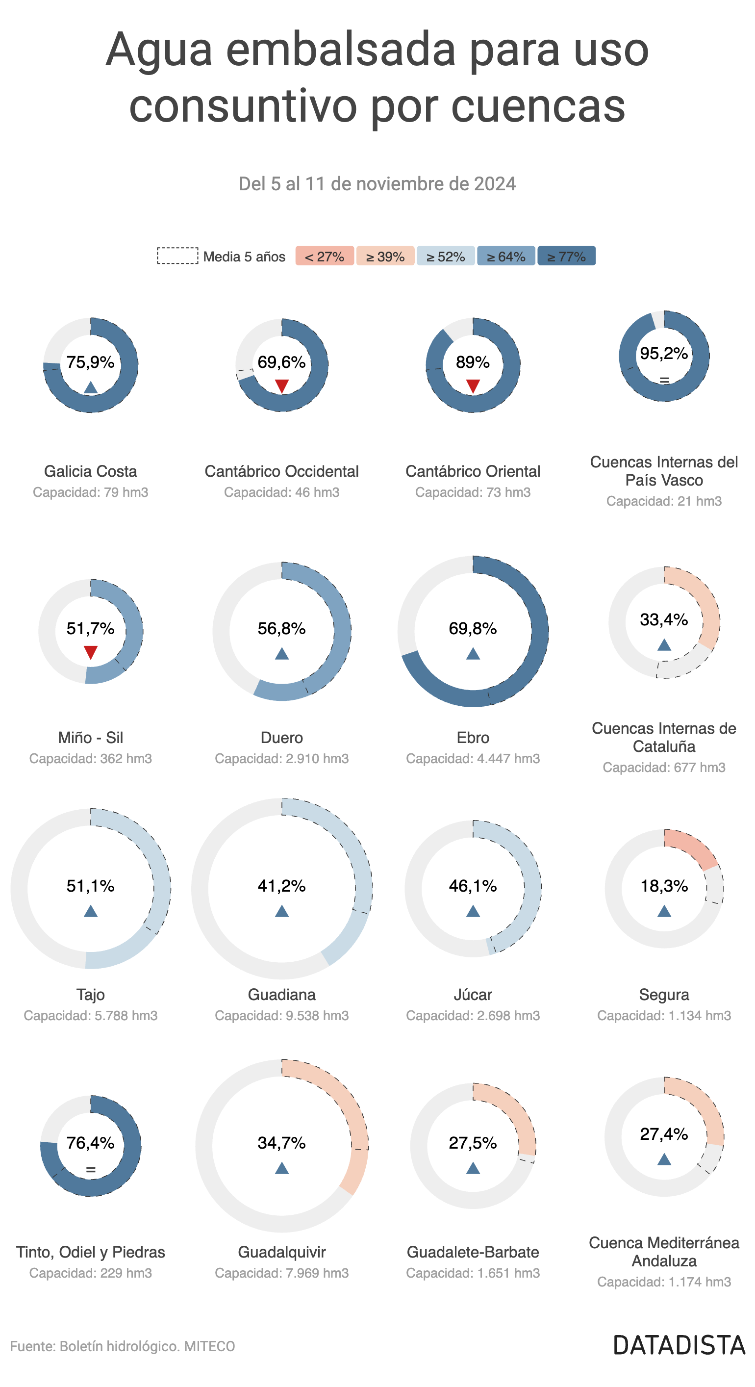 Los embalses destinados a uso consuntivo —es decir, para consumo humano, agrícola e industrial— se encuentran al 44,9 % de su capacidad, con un volumen total de 17.402 hm³. En la última semana, el agua disponible ha aumentado 0,3 puntos, lo que equivale a 128 hm³. Este nivel representa 10,3 puntos más que la media de los últimos cinco años, calculada en 13.329 hm³.