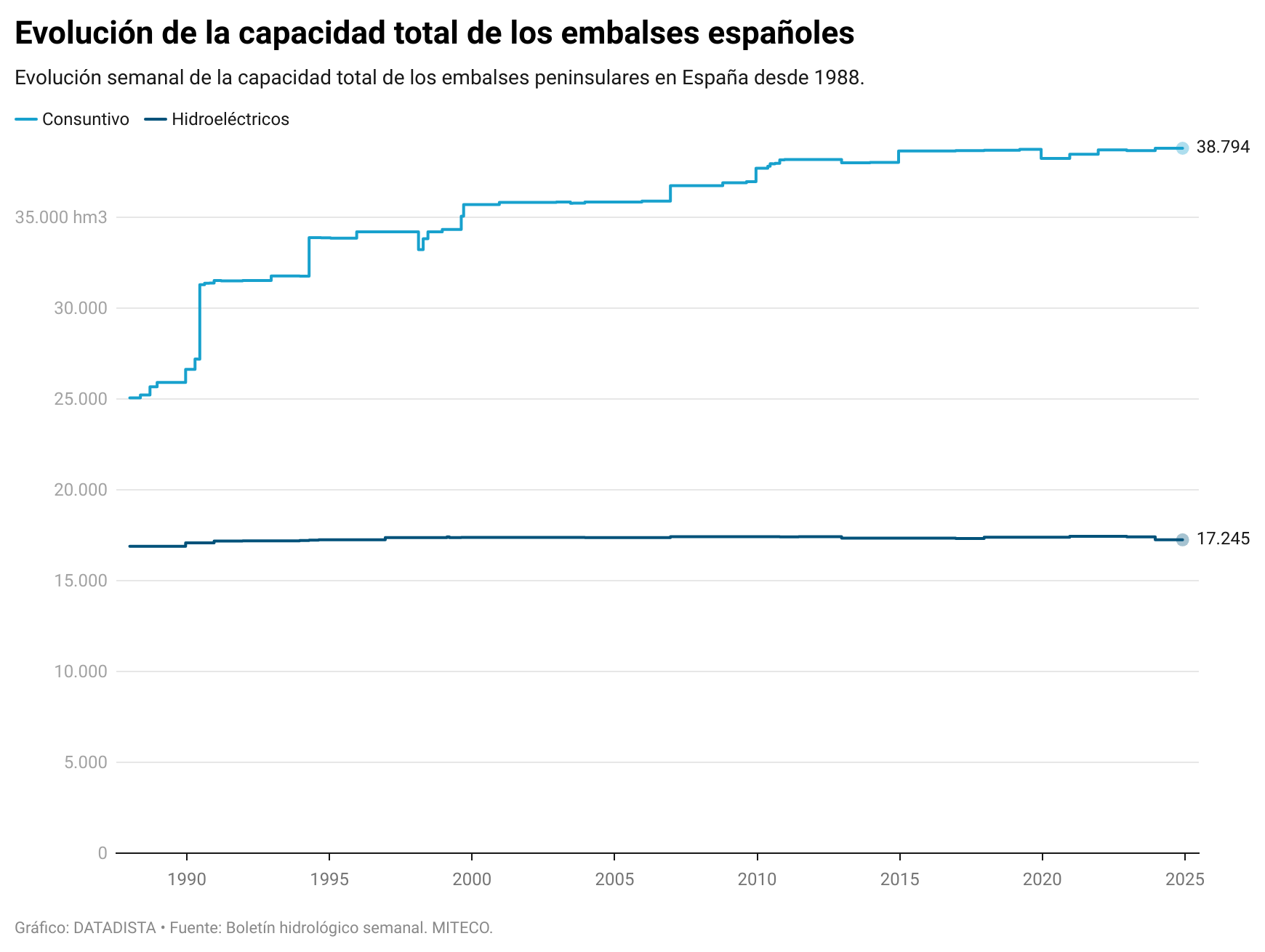 Como puedes observar en el gráfico siguiente, nunca en España hemos tenido tanta capacidad para embalsar agua, con 56.039 hm³, de los cuales 38.794 hm³ corresponden a embalses de uso consuntivo y 17.245 hm³ a embalses hidroeléctricos.