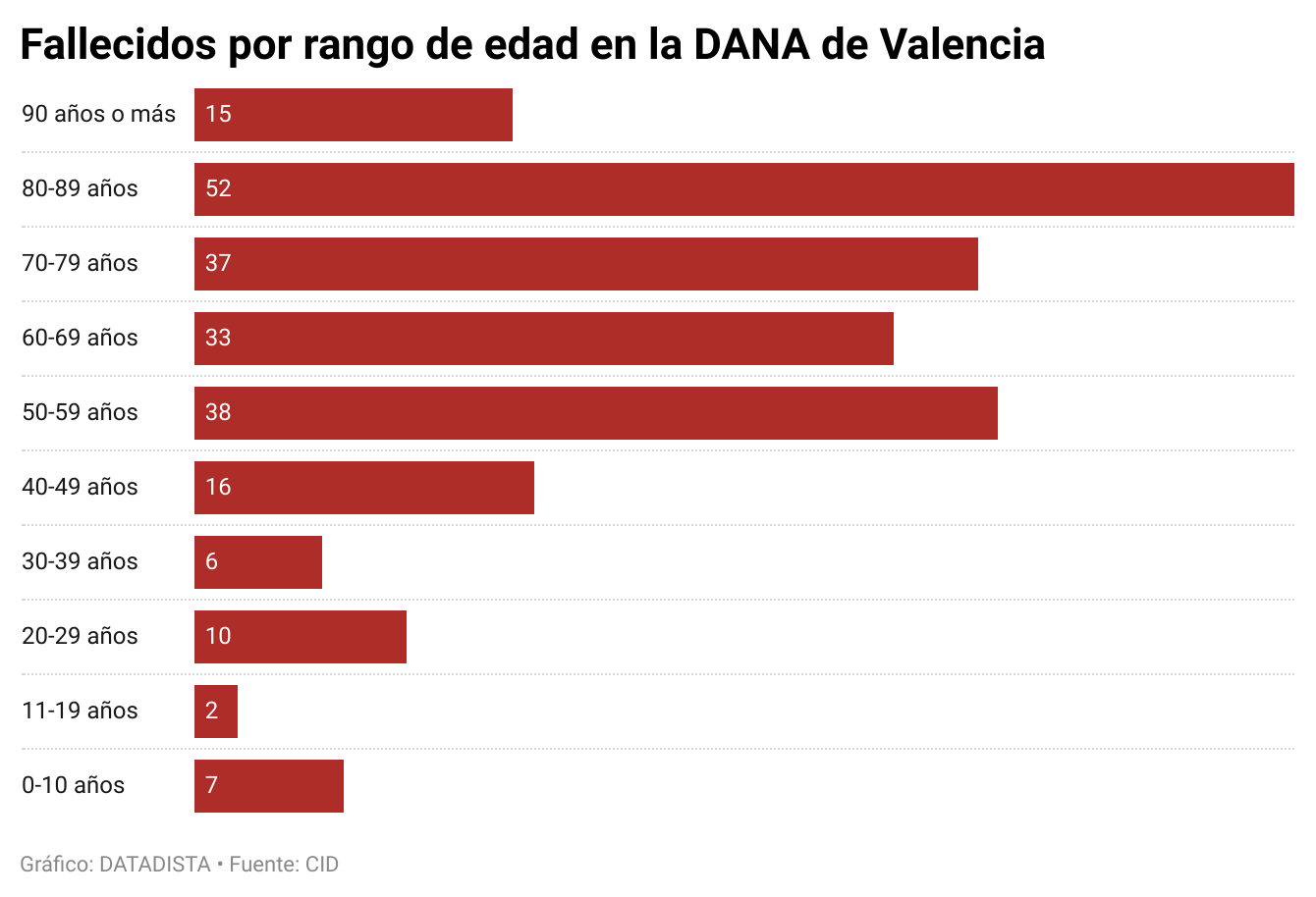 Otro dato que nos muestra la estadística del CID es que casi la mitad de los fallecidos por la DANA en Valencia tenían 70 años o más. En cuanto al sexo, 131 eran hombres y 85, mujeres.