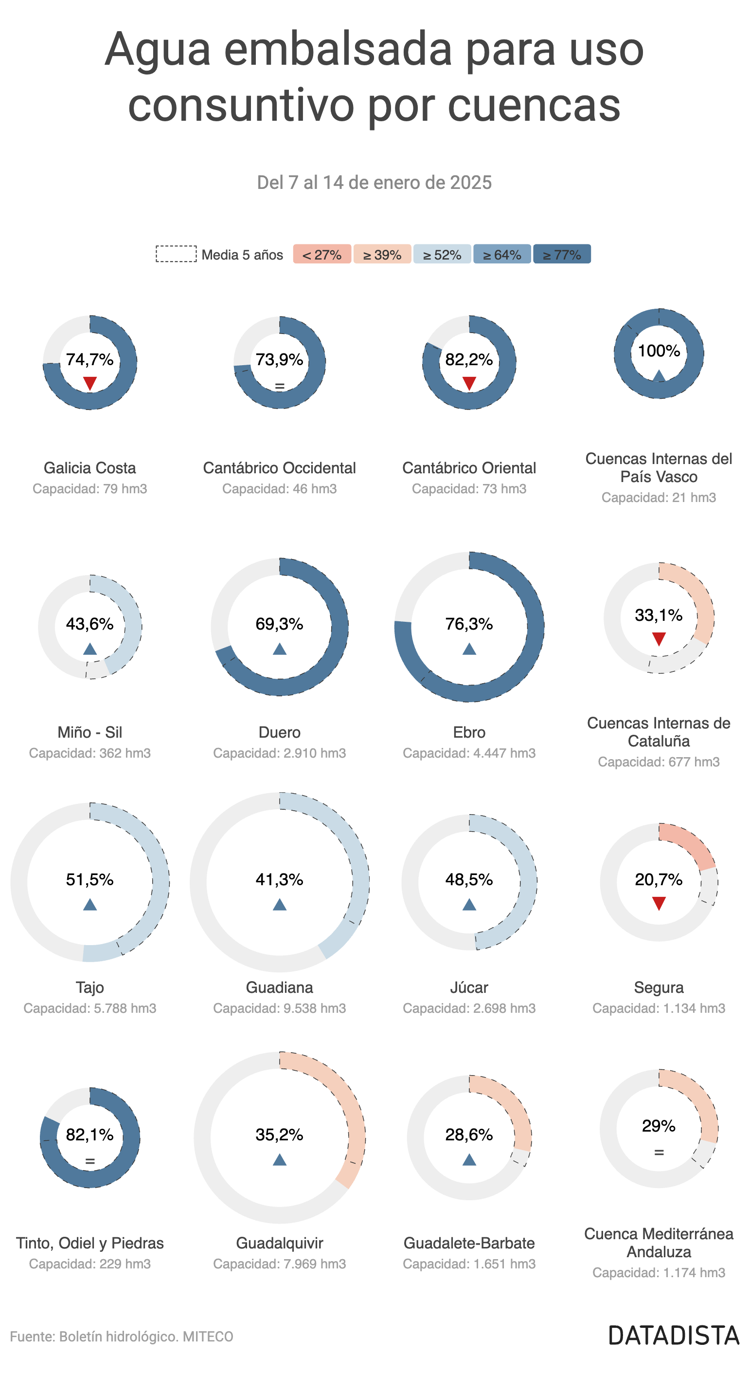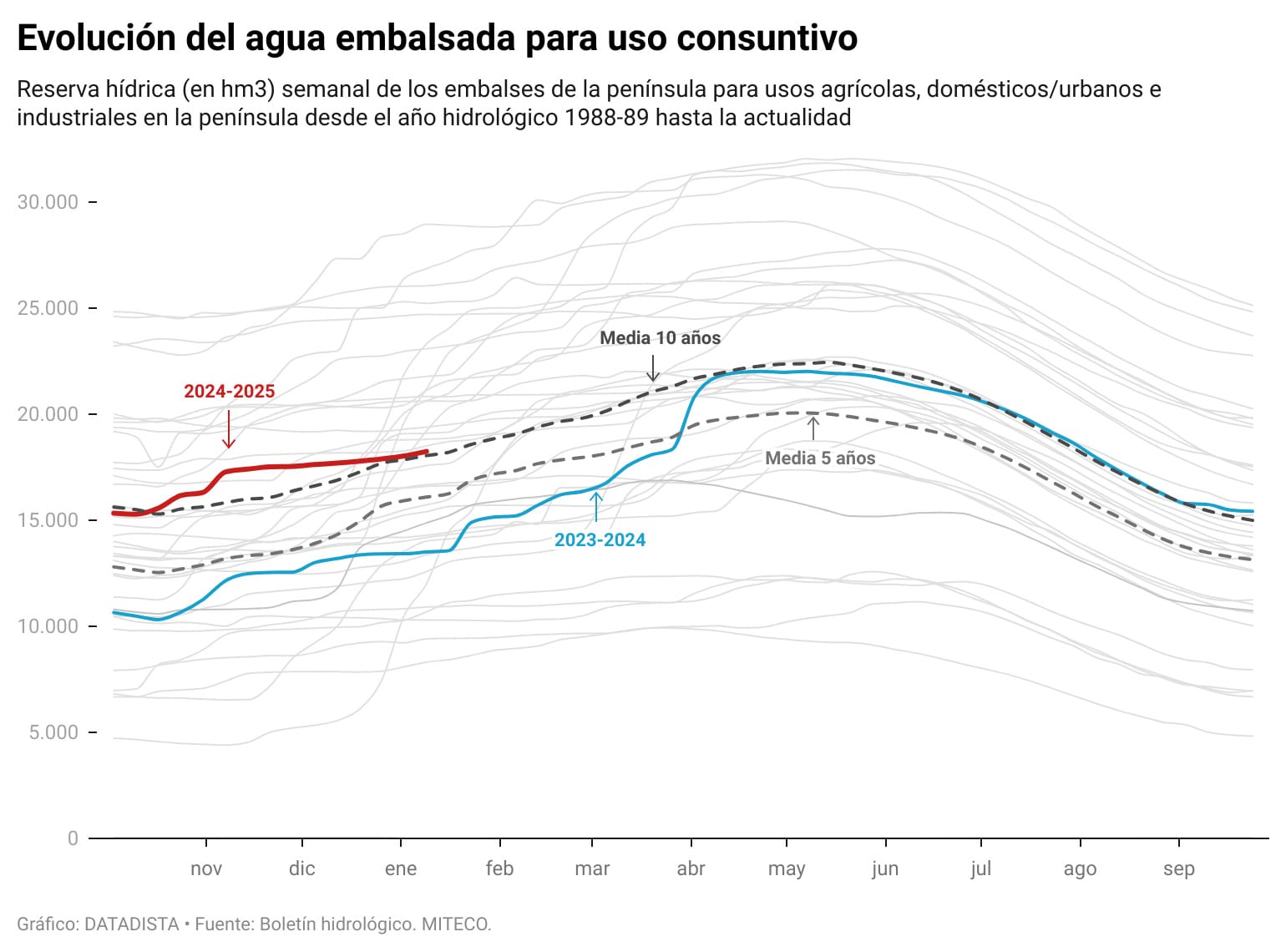 Esto se refleja en el estado de los embalses, donde el agua embalsada para uso consuntivo, destinada a fines humanos, agrícolas e industriales, se encuentra esta semana al 47 % de su capacidad, con 18.240 hm³. En la última semana, el agua disponible ha aumentado 0,5 puntos, con 210 hm³. Son 5,3 puntos más que la media de los últimos cinco años, calculada en 16.091 hm³.