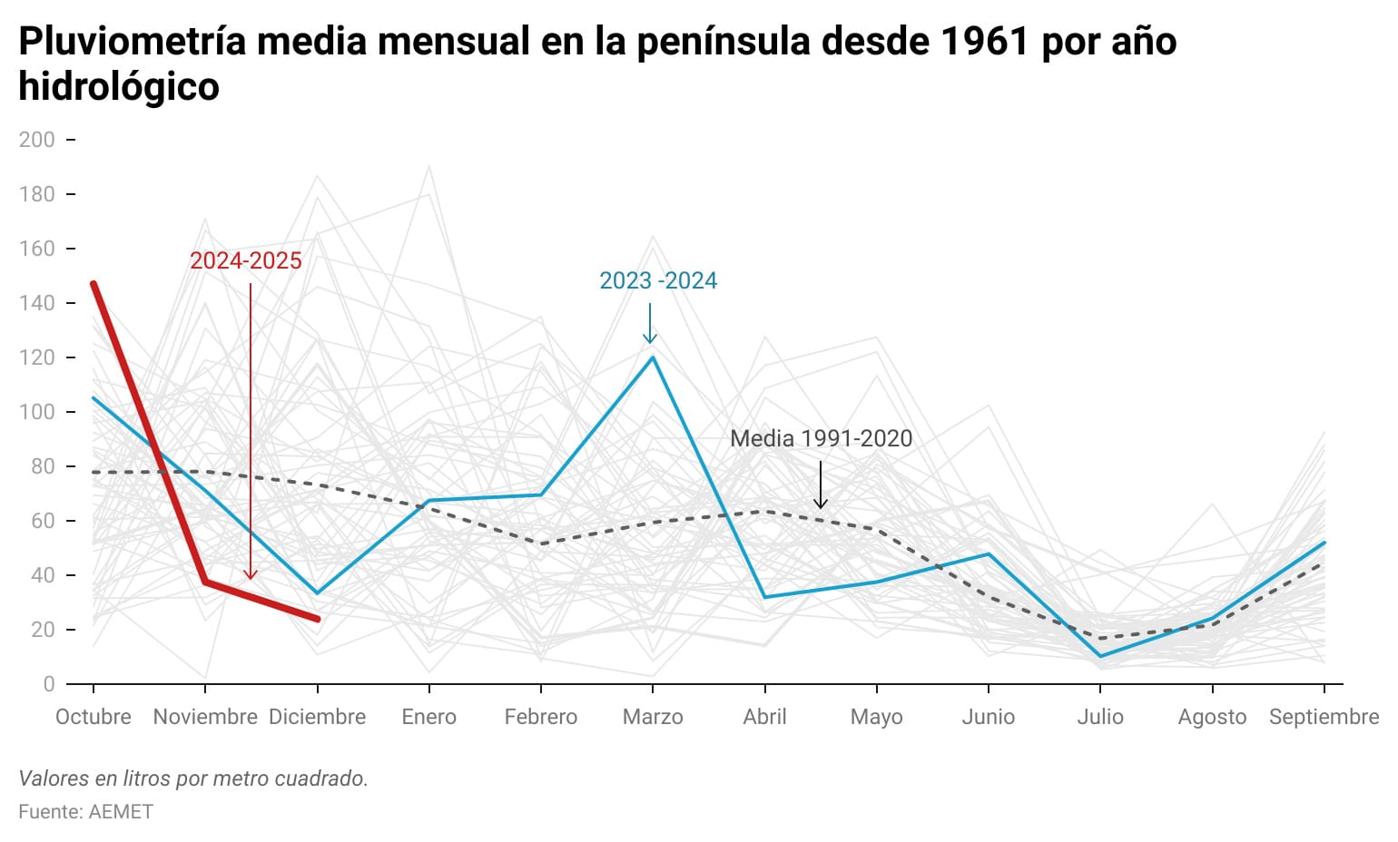 Las precipitaciones en diciembre y durante las primeras semanas de enero han sido muy escasas, excepto en el norte peninsular. Según la Agencia Estatal de Meteorología (AEMET), diciembre fue un mes muy seco: el quinto más seco desde que arrancó la serie histórica en 1961 y el segundo del siglo XXI. En los primeros días de enero, la situación no ha variado mucho.