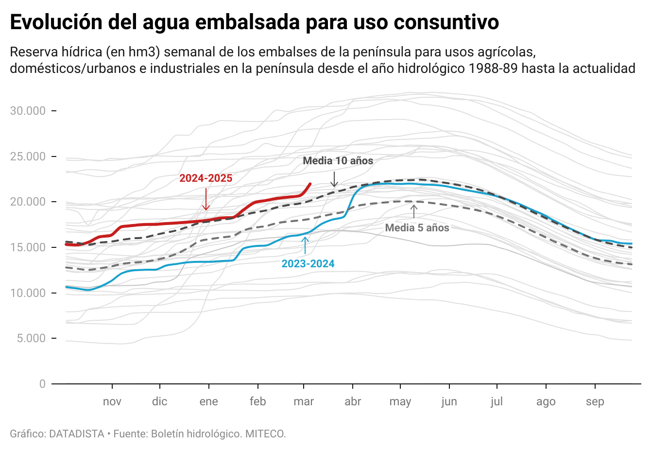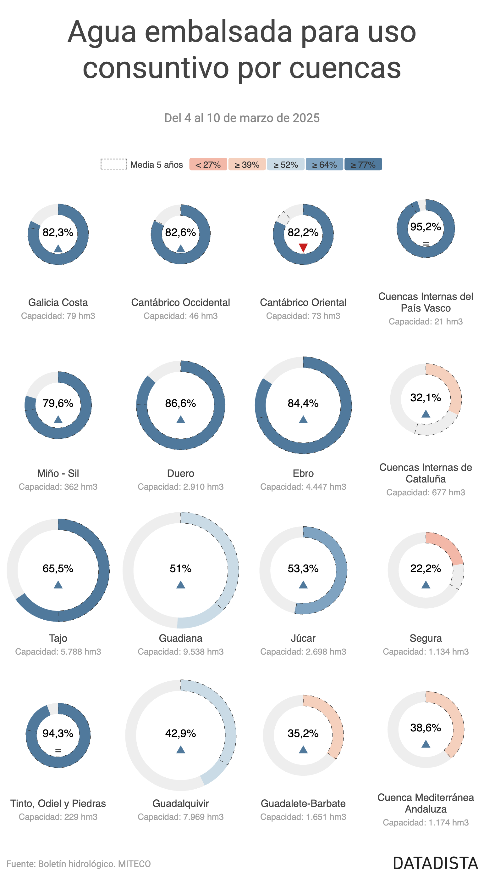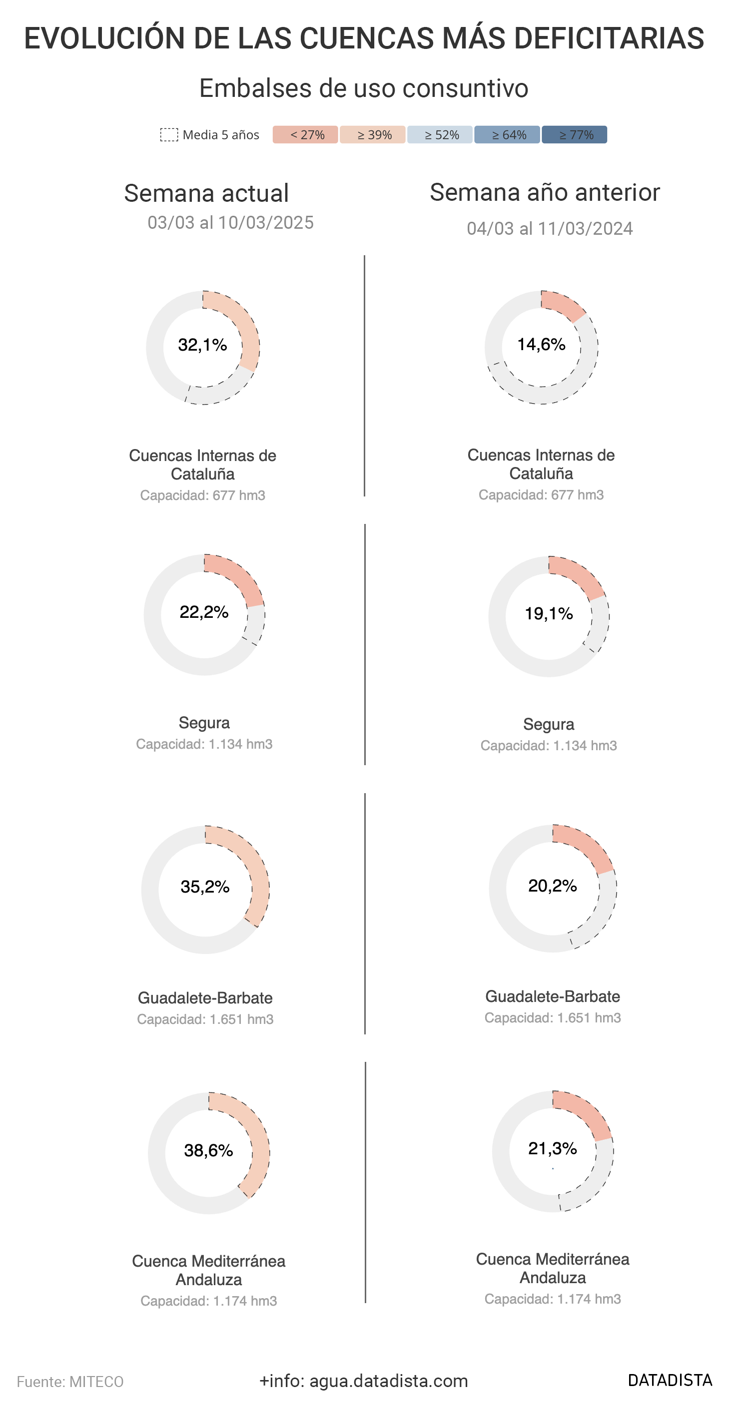 A 10 de marzo de 2025, los embalses de uso consuntivo —destinados al abastecimiento humano, agrícola e industrial— se encuentran al 56,6% de su capacidad con 21.977 hm³. El agua disponible ha aumentado en 3,4 puntos con 1.318 hm³ en la última semana. Son 9,6 puntos más que la media de los últimos cinco años, calculada en 18.129 hm³.