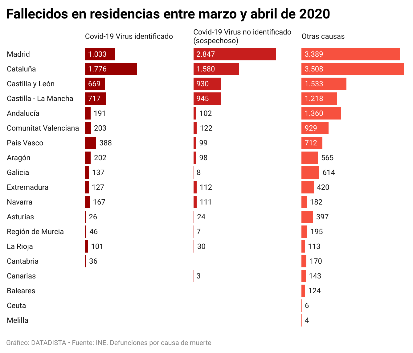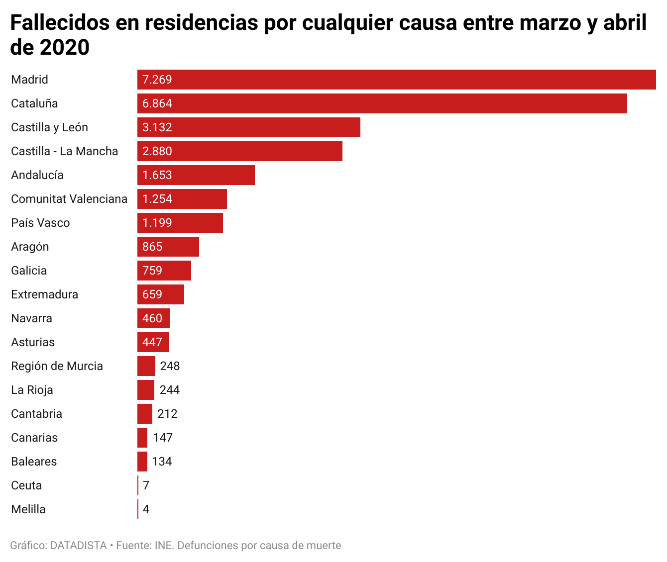 Uno de cada cuatro fallecidos en residencias por cualquier causa durante marzo y abril de 2020 murió en la Comunidad de Madrid, un total de 7.269 personas. En Cataluña, en el mismo periodo, fallecieron 6.864 residentes. También destacan las comunidades autónomas de Castilla y León y Castilla-La Mancha.