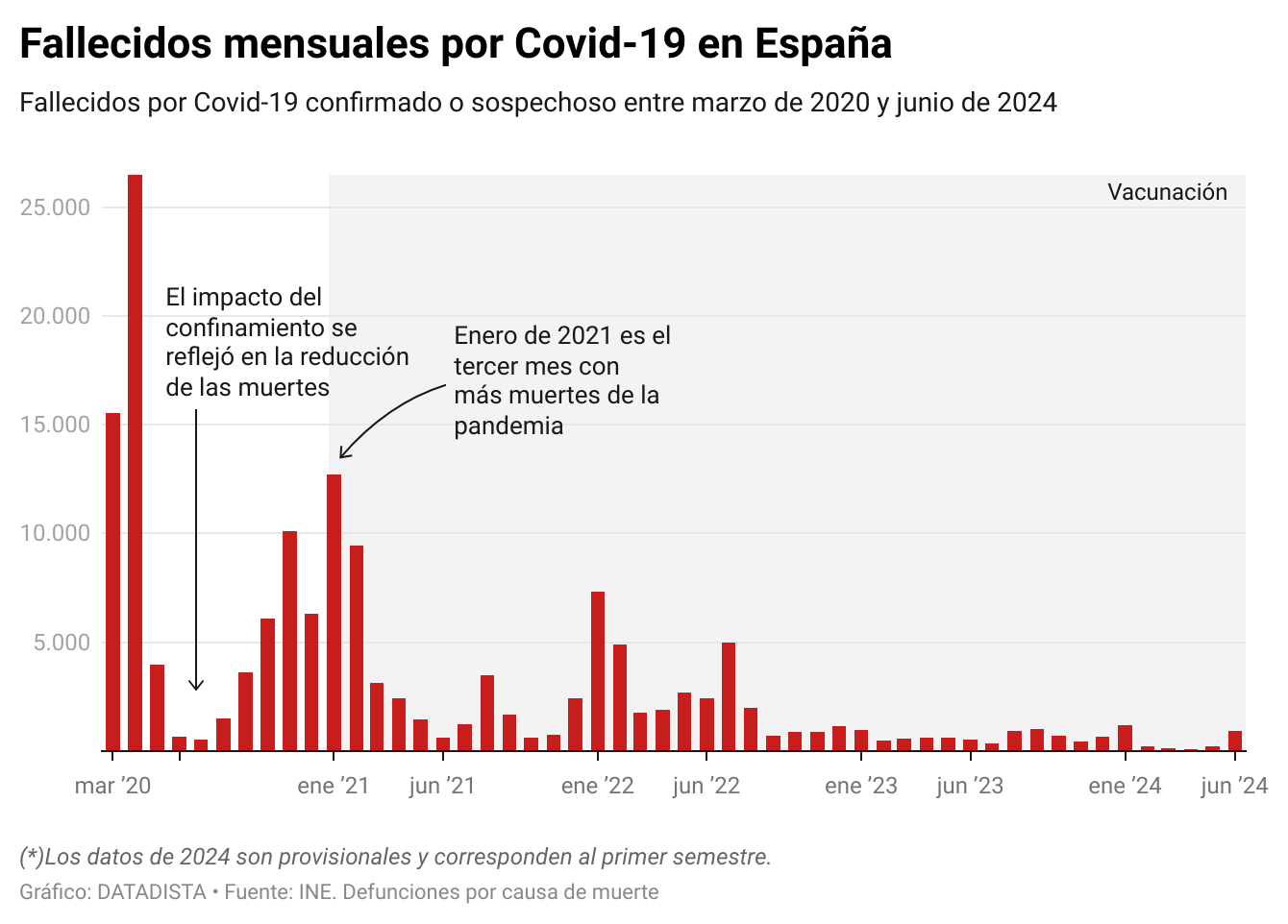 Si observamos el gráfico de fallecidos mensuales por Covid-19 vemos cómo el confinamiento funcionó y salvó miles de vidas. Mira el número de fallecidos en junio y julio de 2020.