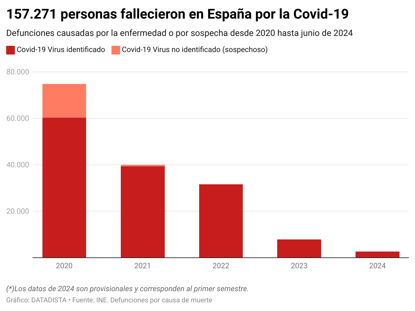 Hasta junio de 2024, en España fallecieron 157.271 personas por Covid-19 (confirmados y sospechosos), según los datos oficiales recopilados a partir de los certificados de defunción. Sin embargo, durante la primera ola, la falta de test y la incertidumbre diagnóstica pudieron haber llevado a que algunos fallecimientos por Covid-19 se registraran bajo otras categorías, como enfermedades respiratorias no especificadas, neumonía o incluso patologías previas agravadas por el virus. Esto implica que la cifra total de fallecidos por Covid-19 podría estar subestimada debido a limitaciones en el diagnóstico, especialmente durante la primera ola.