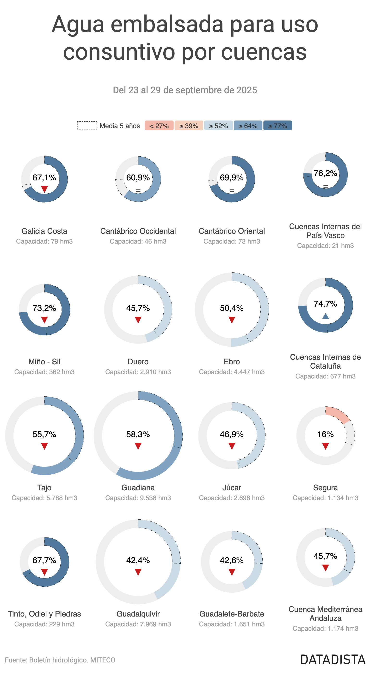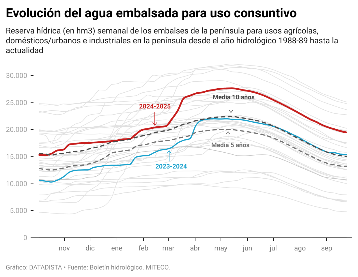 El año hidrológico ha terminado con las reservas de agua destinadas a usos consuntivos, para abastecimiento humano, agrícola e industrial, en 19.490 hectómetros cúbicos, lo que equivale al 50,2% de la capacidad total. En la última semana, el volumen embalsado se ha reducido en 254 hm³, una bajada de 0,7 puntos. Pese a este descenso, los embalses mantienen niveles elevados: la cifra actual está 16,2 puntos por encima de la media de los últimos cinco años, calculada en 13.142 hm³.