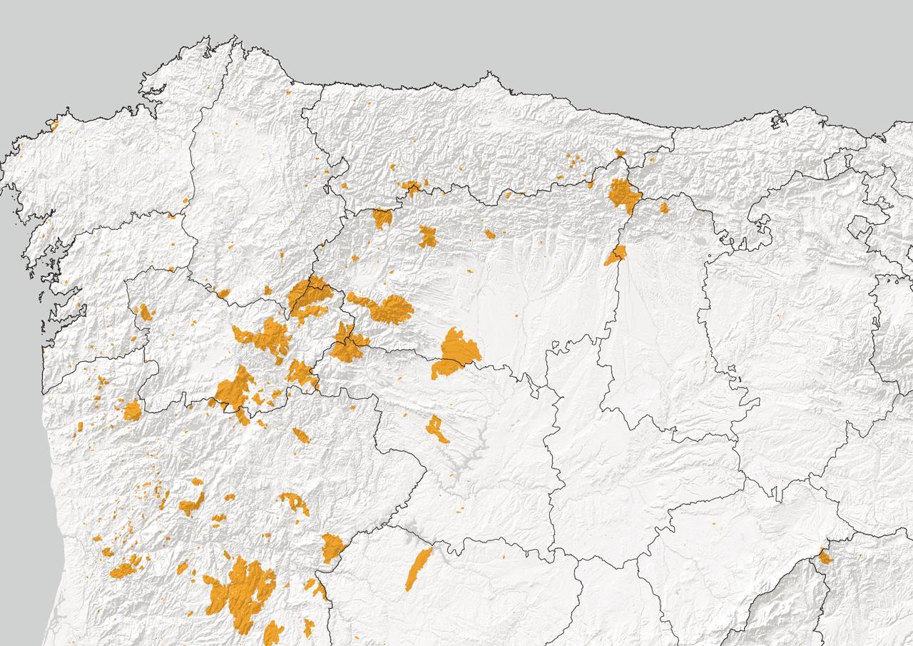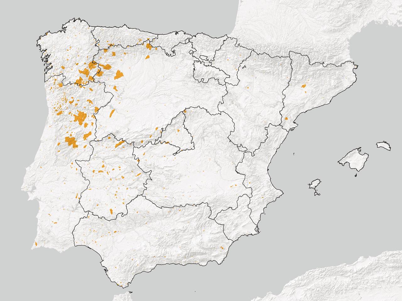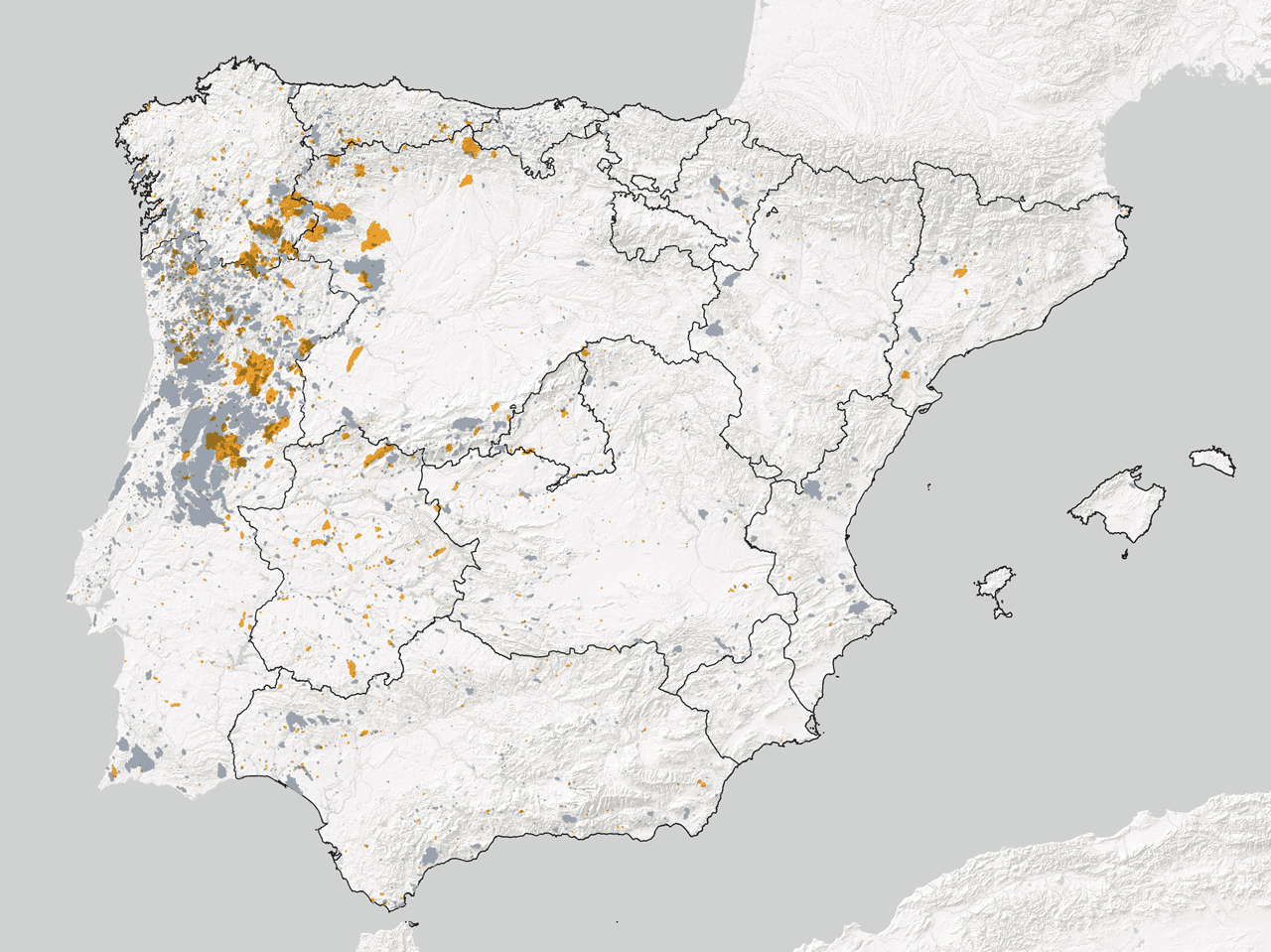 En este mapa de detalle se aprecia con claridad la concentración de incendios en el noroeste. Las provincias de Ourense y León acumulan la mayor parte de los grandes fuegos de la temporada.