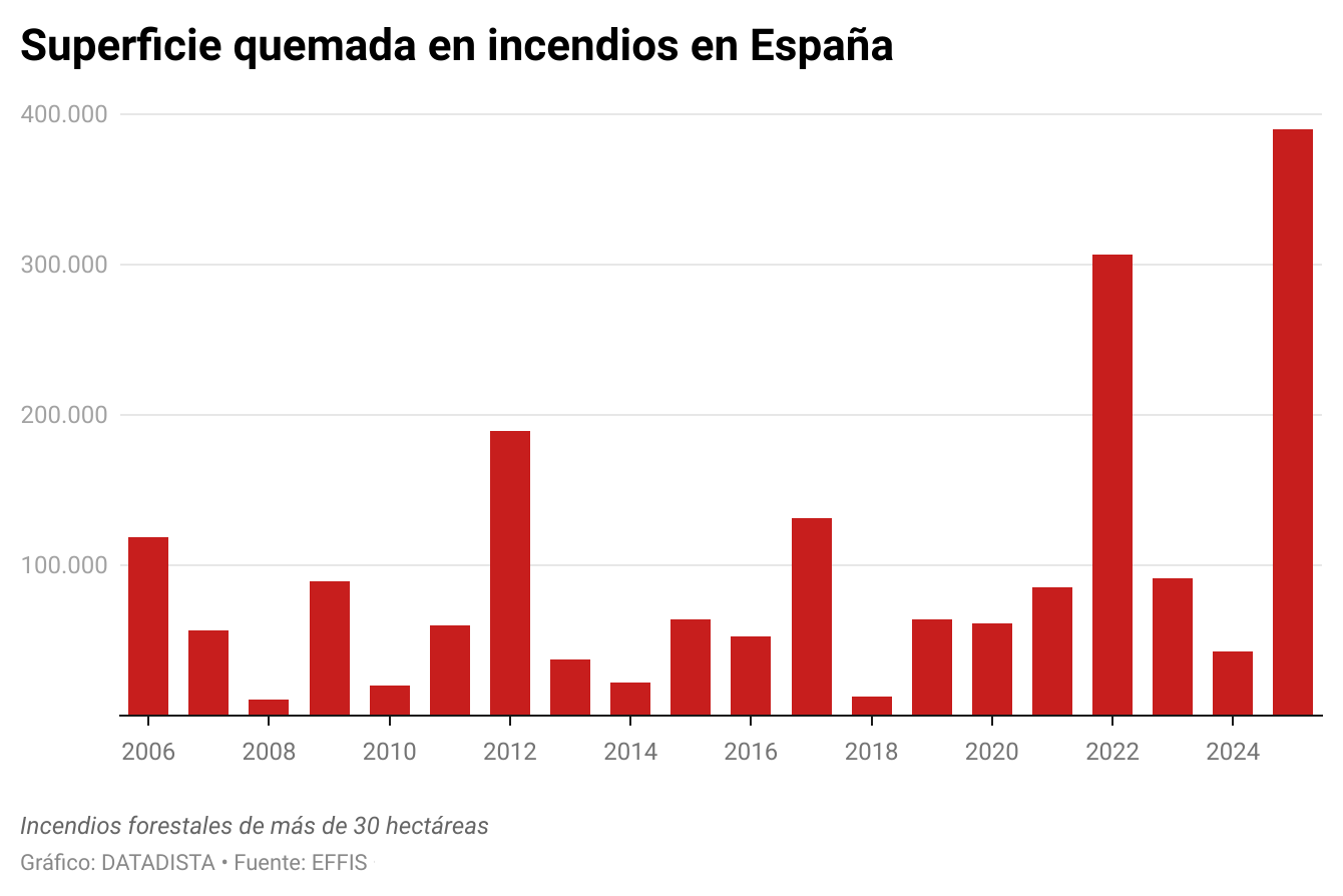 España ha vivido uno de los peores veranos que se recuerdan por los incendios forestales. Ocho personas han perdido la vida y, según los datos del sistema europeo EFFIS (Copernicus), el fuego ha calcinado unas 390.000 hectáreas. En total, se han registrado 65 grandes incendios, aquellos que superan las 500 hectáreas quemadas. Es el peor año de la serie histórica de Copernicus, iniciada en 2006.