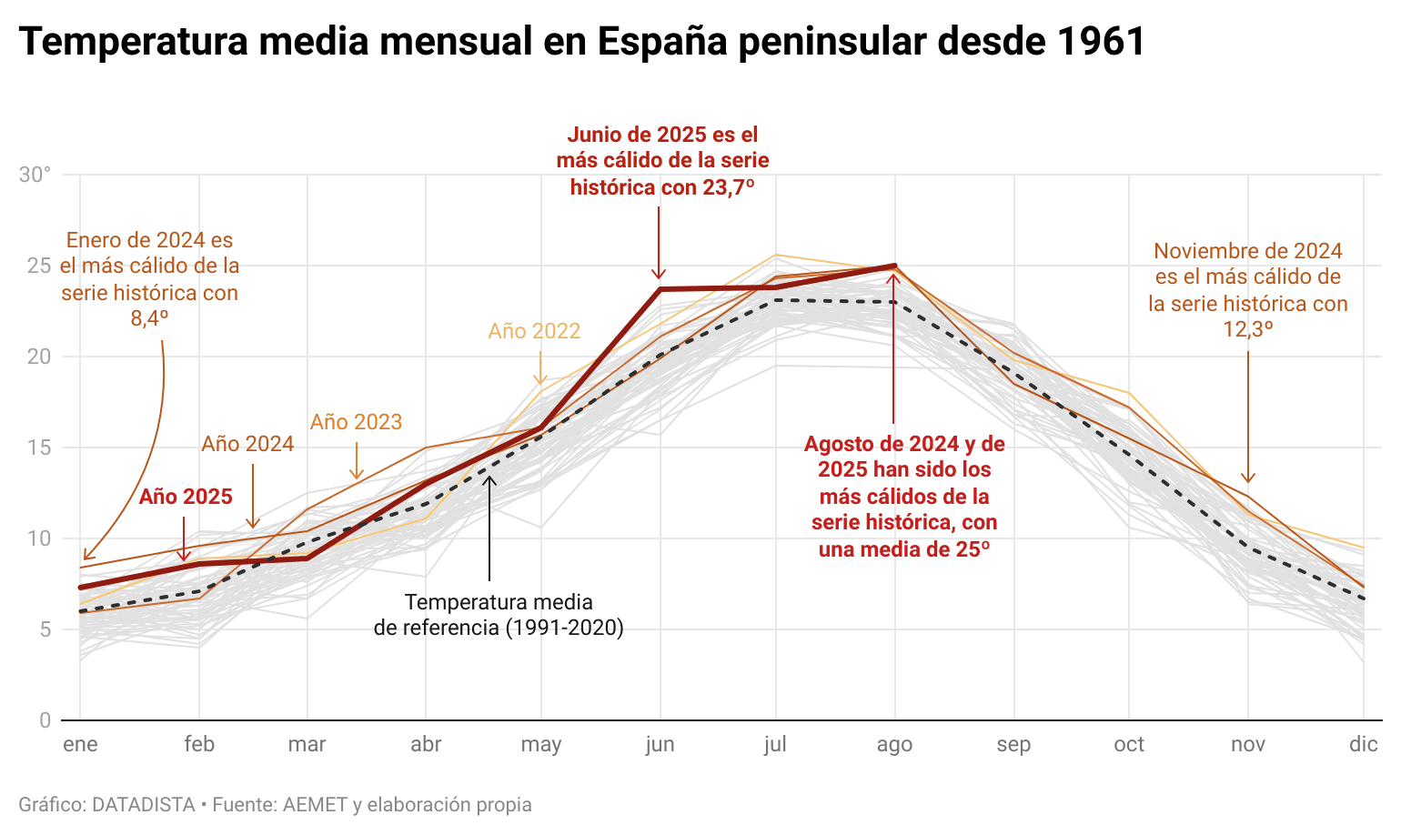 El verano de 2025 fue el más cálido desde que existen registros en España. Según el Ministerio para la Transición Ecológica, la temperatura media alcanzó los 24,2 °C, 2,1 °C por encima del promedio del periodo 1991-2020. La combinación de olas de calor más largas, frecuentes e intensas generó un escenario propicio para los grandes incendios. Un estudio del grupo internacional World Weather Attribution concluye que las condiciones extremas de calor, sequedad y viento que favorecieron los fuegos en España y Portugal fueron hasta 40 veces más probables por efecto del cambio climático y un 30% más intensas que en un clima preindustrial.