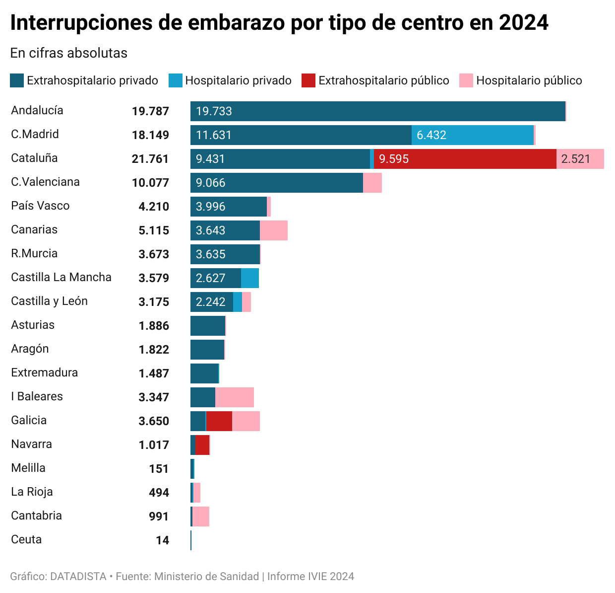 Es en el gráfico precisamente de los datos absolutos de abortos practicados por CCAA en 2024, en el que empezamos a ver grandes diferencias en las regiones más pobladas y que por ello siempre están a la cabeza de las estadísticas. En Andalucía este derecho se presta casi en su totalidad en centros privados extrahospitalarios, mientras que en Madrid, junto a los extrahospitalarios privados ganan también protagonismo los centros hospitalarios privados.