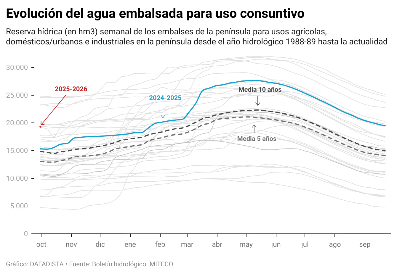 El nuevo año hidrológico ha comenzado con las reservas de agua destinadas a usos consuntivos —abastecimiento humano, agrícola e industrial— en 19.307 hectómetros cúbicos, lo que equivale al 49,8% de la capacidad total. En la última semana, el volumen embalsado se ha reducido en 183 hm³, una bajada de 0,5 puntos. A pesar de este descenso, los embalses mantienen niveles elevados: la cifra actual está 16 puntos por encima de la media de los últimos cinco años, calculada en 13.063 hm³.