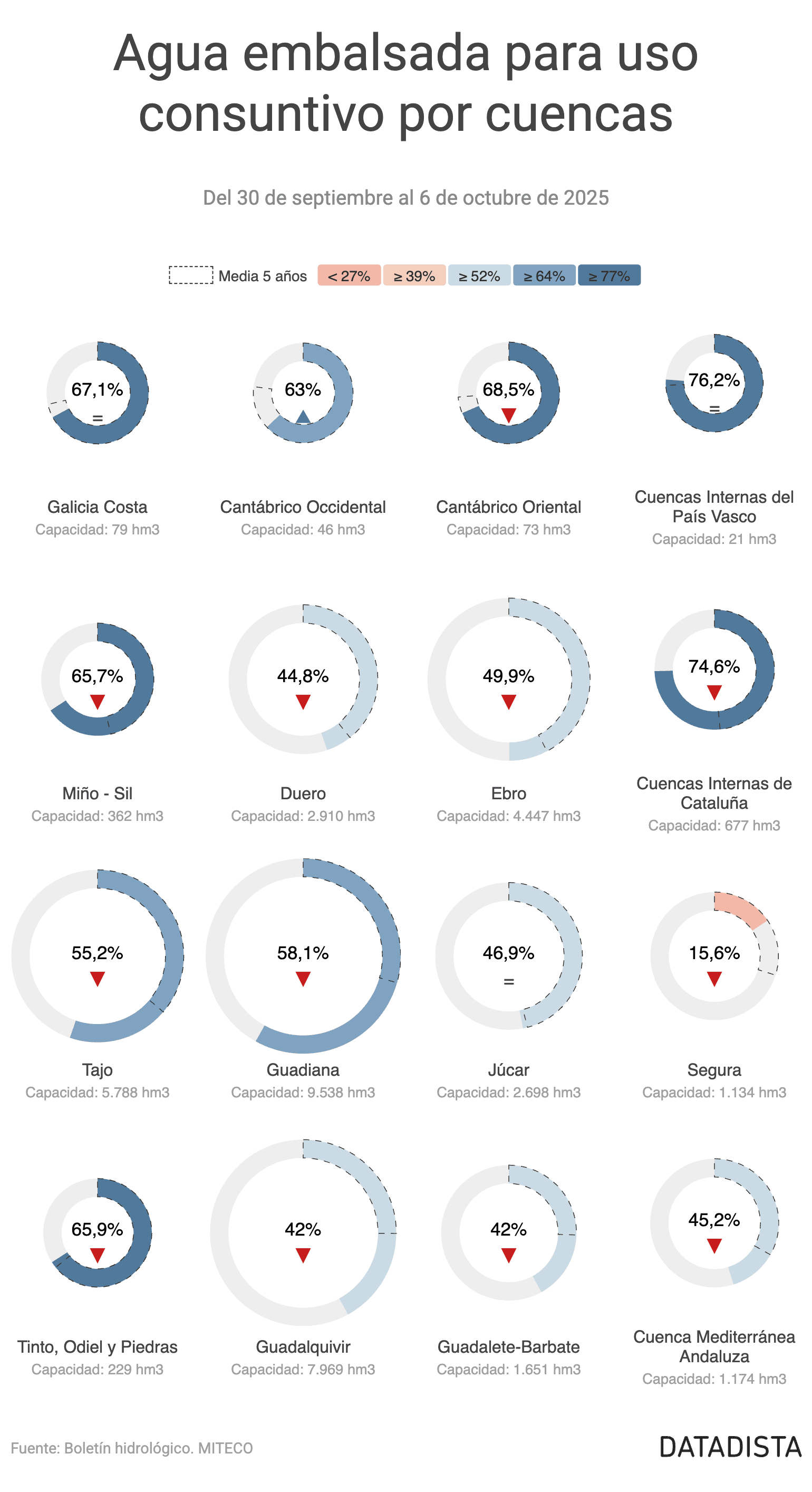 Entre los descensos más significativos se encuentra la cuenca del Miño-Sil, que pierde 7,5 puntos y se sitúa en el 65,75% con 238 hm³. Le sigue Tinto, Odiel y Piedras, que baja 1,7 puntos hasta el 65,94% con 151 hm³. El Cantábrico Oriental desciende 1,4 puntos y queda en el 68,49% con 50 hm³. El Duero pierde 0,9 puntos, situándose en el 44,78% con 1.303 hm³.