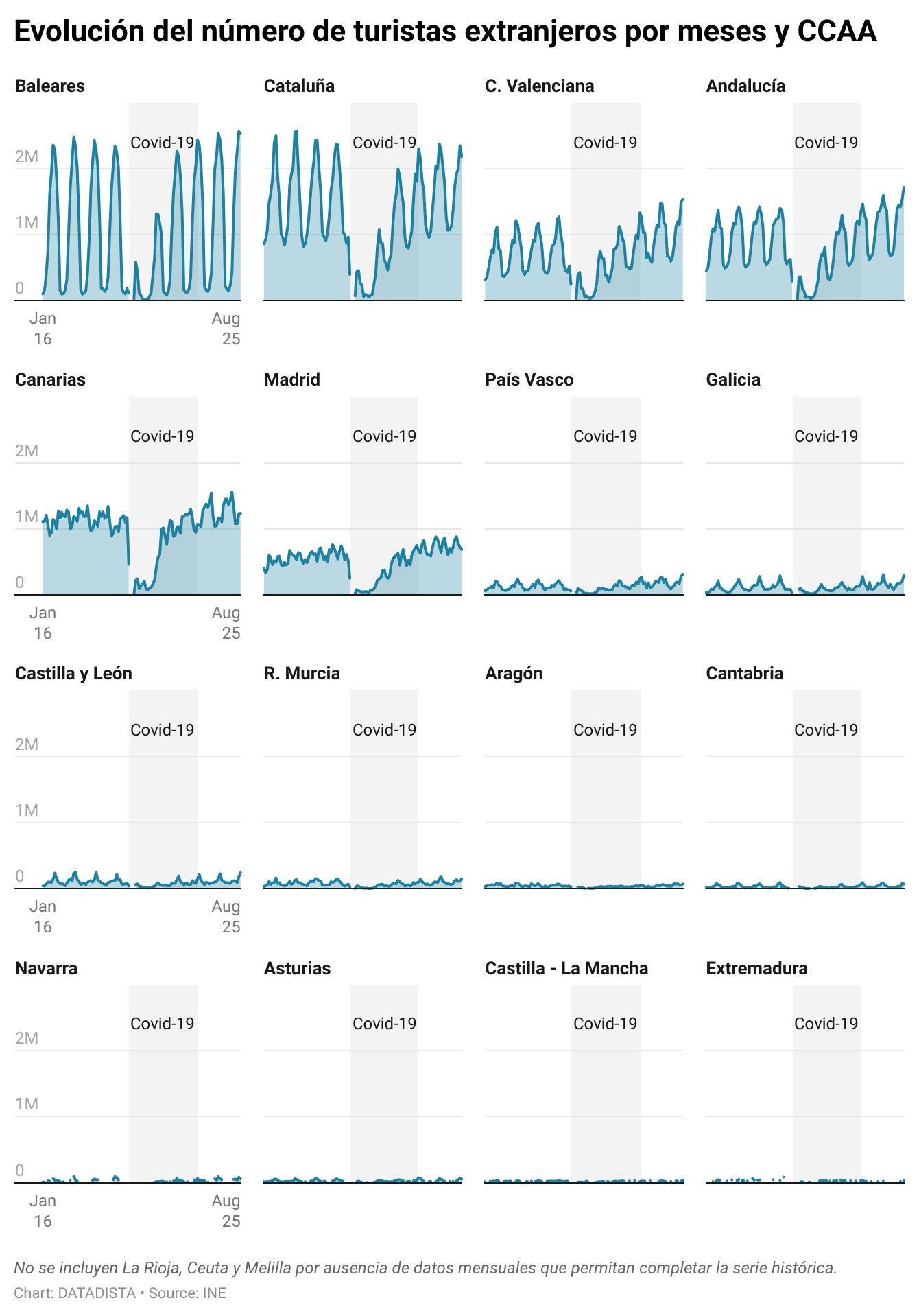 En este gráfico se muestra la evolución mensual de turistas internacionales por comunidad autónoma y su marcada estacionalidad desde enero de 2016 a agosto de 2025.