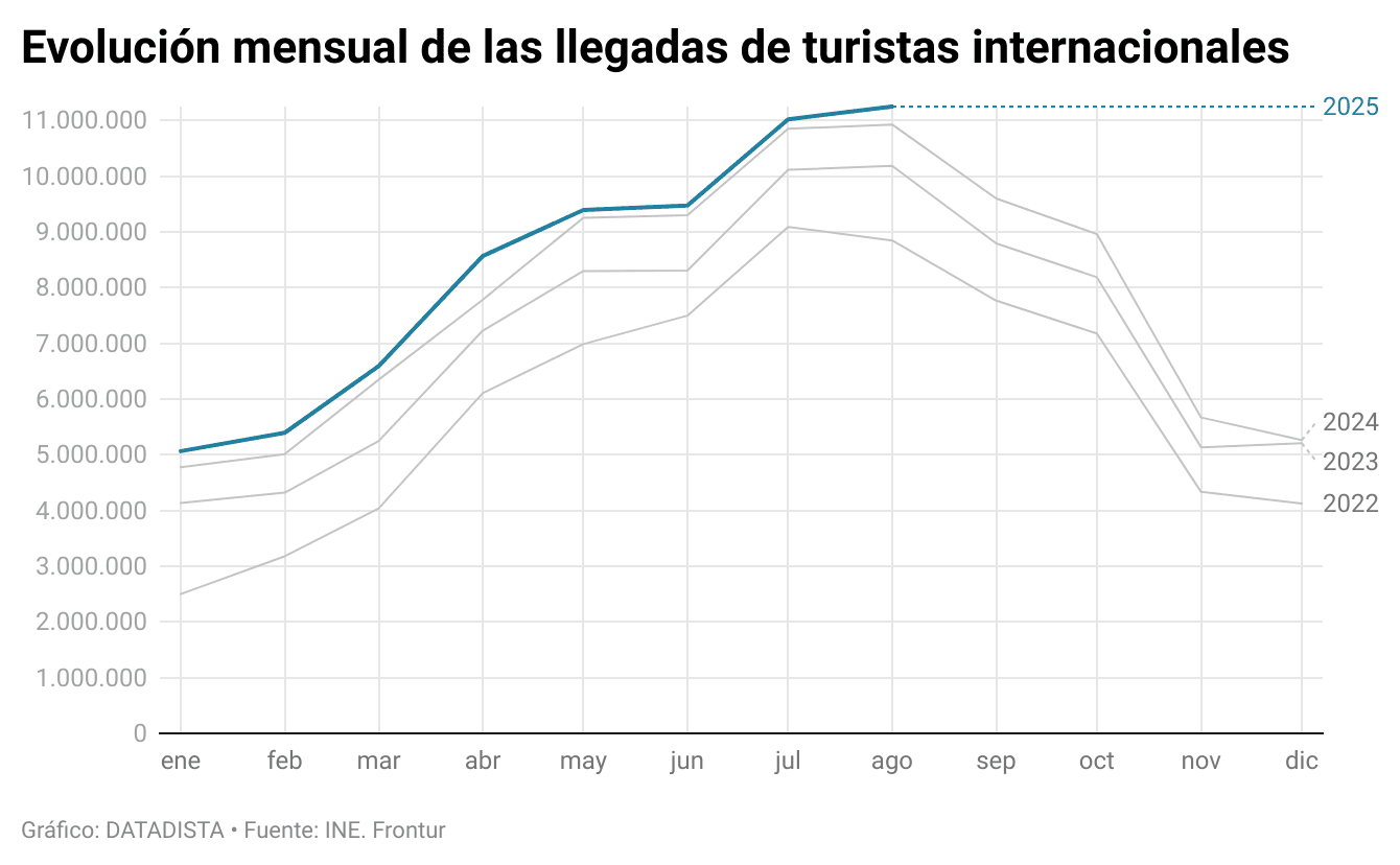 El año 2025 también va camino del récord, aunque la tendencia apunta que se quedará por debajo de esa barrera simbólica. Entre enero y agosto llegaron 66,8 millones de turistas, más que nunca en ese periodo, según los datos de Frontur publicados a principios de este mes por el Instituto Nacional de Estadística (INE).