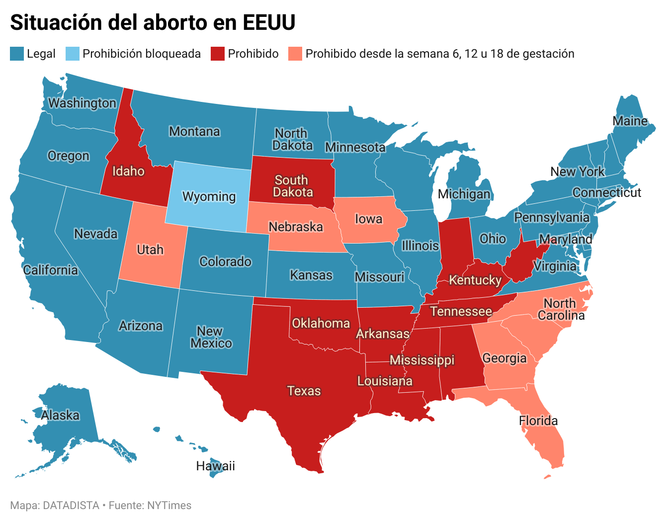 A día de hoy, como consecuencia de aquel cambio de la Constitución, este es el aspecto de EEUU en función de los estados que mantienen o han anulado, total o parcialmente, el derecho al aborto.