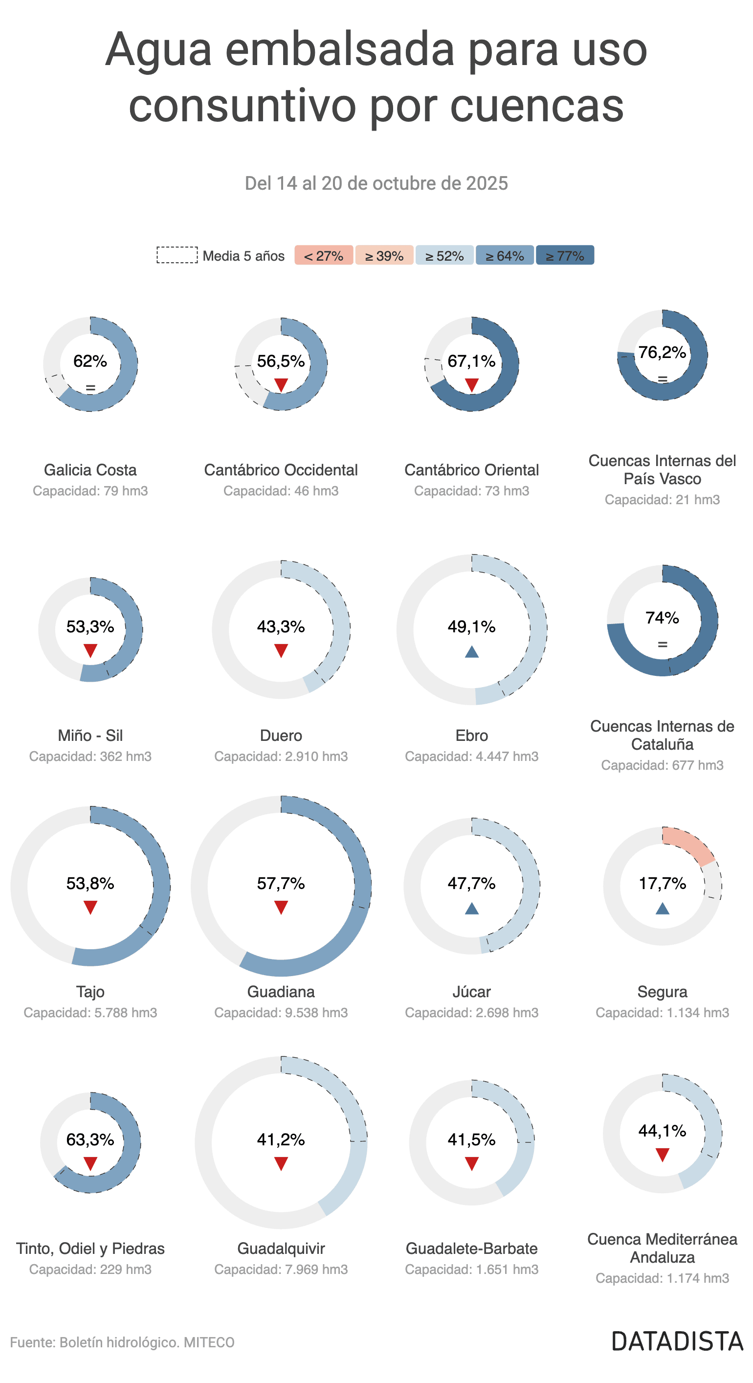 Esta semana, la mayoría de las cuencas destinadas a uso consuntivo han vuelto a reducir sus reservas. Entre los descensos más destacados está el Miño-Sil, que pierde 5,5 puntos y se sitúa en el 53,31% con 193 hm³. También bajan el Cantábrico Occidental, con una caída de 2,2 puntos hasta el 56,52%, y el Cantábrico Oriental, que desciende 1,4 puntos hasta el 67,12%. El Tajo baja 0,7 puntos y se coloca en el 53,82% con 3.115 hm³, mientras que el Duero pierde 0,6 puntos y se queda en el 43,30% con 1.260 hm³. La Cuenca Mediterránea Andaluza también desciende ligeramente hasta el 44,12% con 518 hm³. Por último, el Tinto, Odiel y Piedras retrocede 0,4 puntos y se sitúa en el 63,32% con 145 hm³. Los embalses de la cuenca del Segura aumentan su nivel gracias al agua procedente del trasvase.