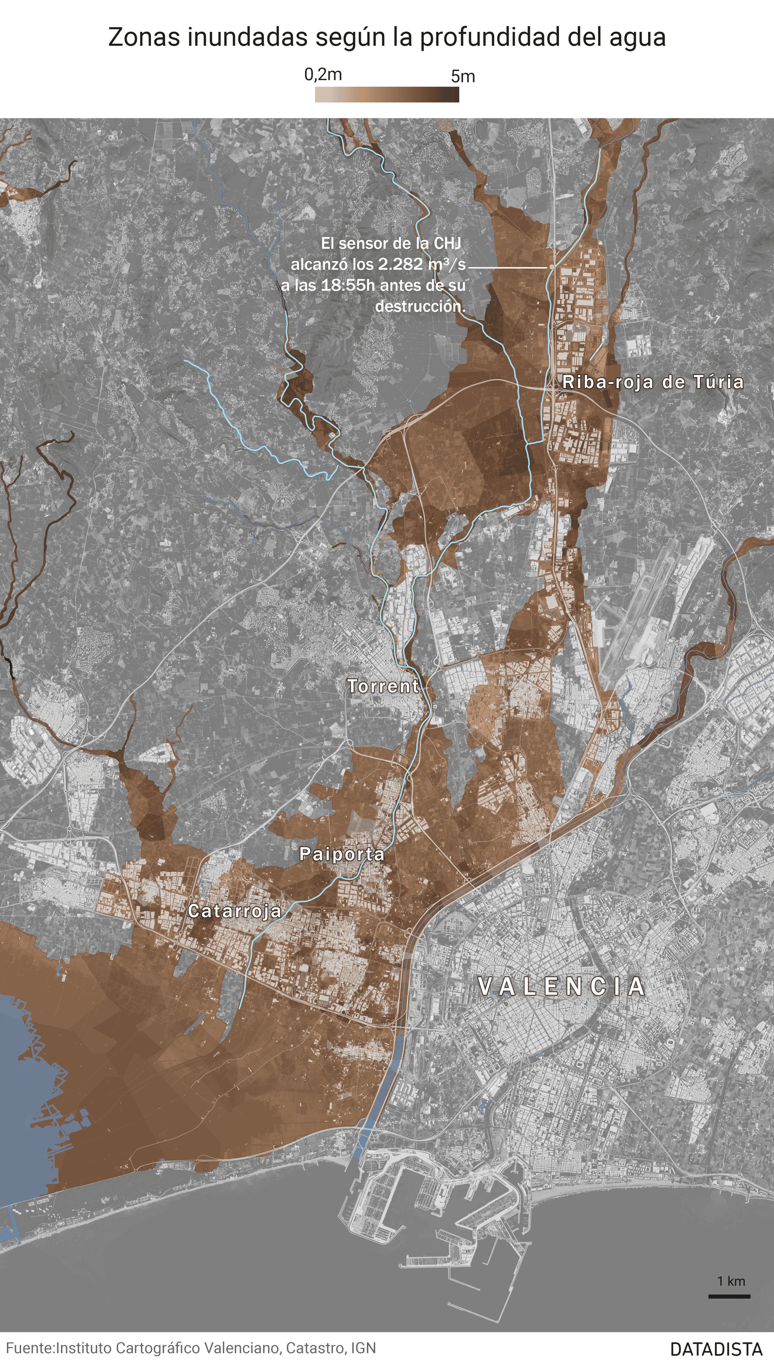 Desde este verano disponemos de una cartografía oficial publicada por el Institut Cartogràfic Valencià, que incluye tanto la delimitación de la zona de inundación como más de 8.700 puntos de medición con la profundidad del agua, recopilados de diferentes organismos e instituciones. En DATADISTA hemos cruzado ambas capas para ofrecer un mapa más detallado de la superficie inundada en la zona cero de la catástrofe.
