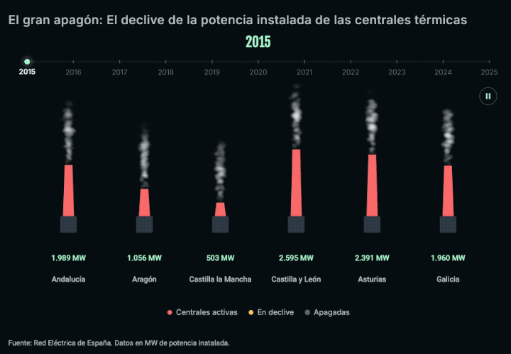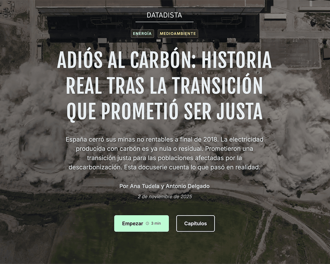 Y ahora, una de esas cosas que tanto nos gustan anunciaros por aquí. Hoy hemos publicado los dos primeros capítulos de una investigación en formato de serie documental de la que veníamos hablándote y que por fin ve la luz. Llevamos más de tres años trabajando en ella. Desde mayo de 2022 hemos recorrido pueblos de España afectados por el cierre de minas y centrales térmicas para escuchar sus historias y observar de primera mano los cierres, las voladuras de centrales, así como el impacto social y económico en los municipios afectados. Hemos cruzado España de punta a punta varias veces: de As Pontes, en A Coruña, a Carboneras, en Almería; de Langreo, en Asturias, a Andorra, en Teruel, y vuelta a As Pontes.