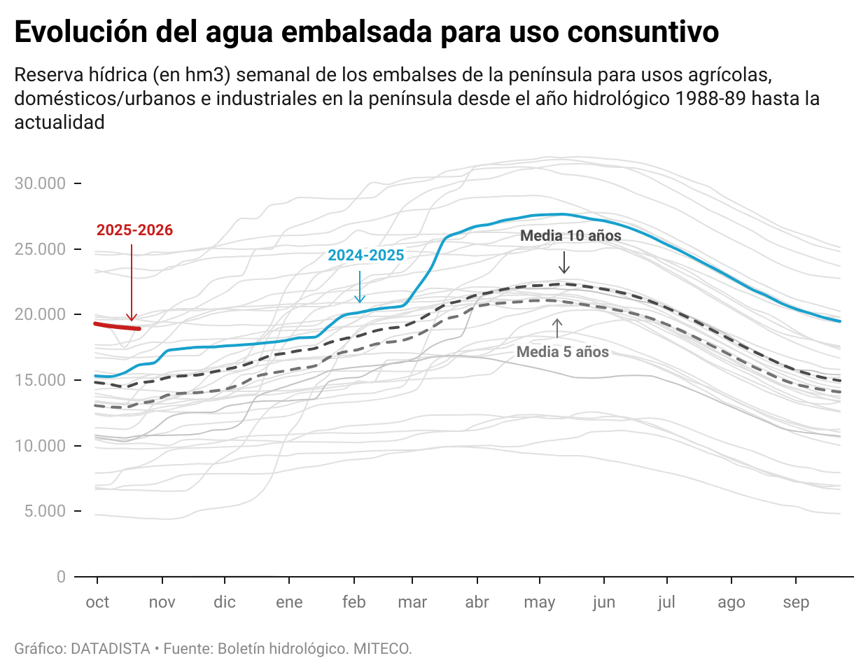 Las reservas de agua destinadas a usos consuntivos, es decir, abastecimiento humano, agrícola e industrial, están esta semana en 18.916 hectómetros cúbicos, el 48,8% de la capacidad total. En la última semana el volumen embalsado se ha reducido en 97 hm³, una bajada de 0,3 puntos. Aún vivimos de las lluvias de la pasada primavera y los embalses se sitúan 14,6 puntos por encima de la media de los últimos cinco años, frente a una media de 13.226 hm³.