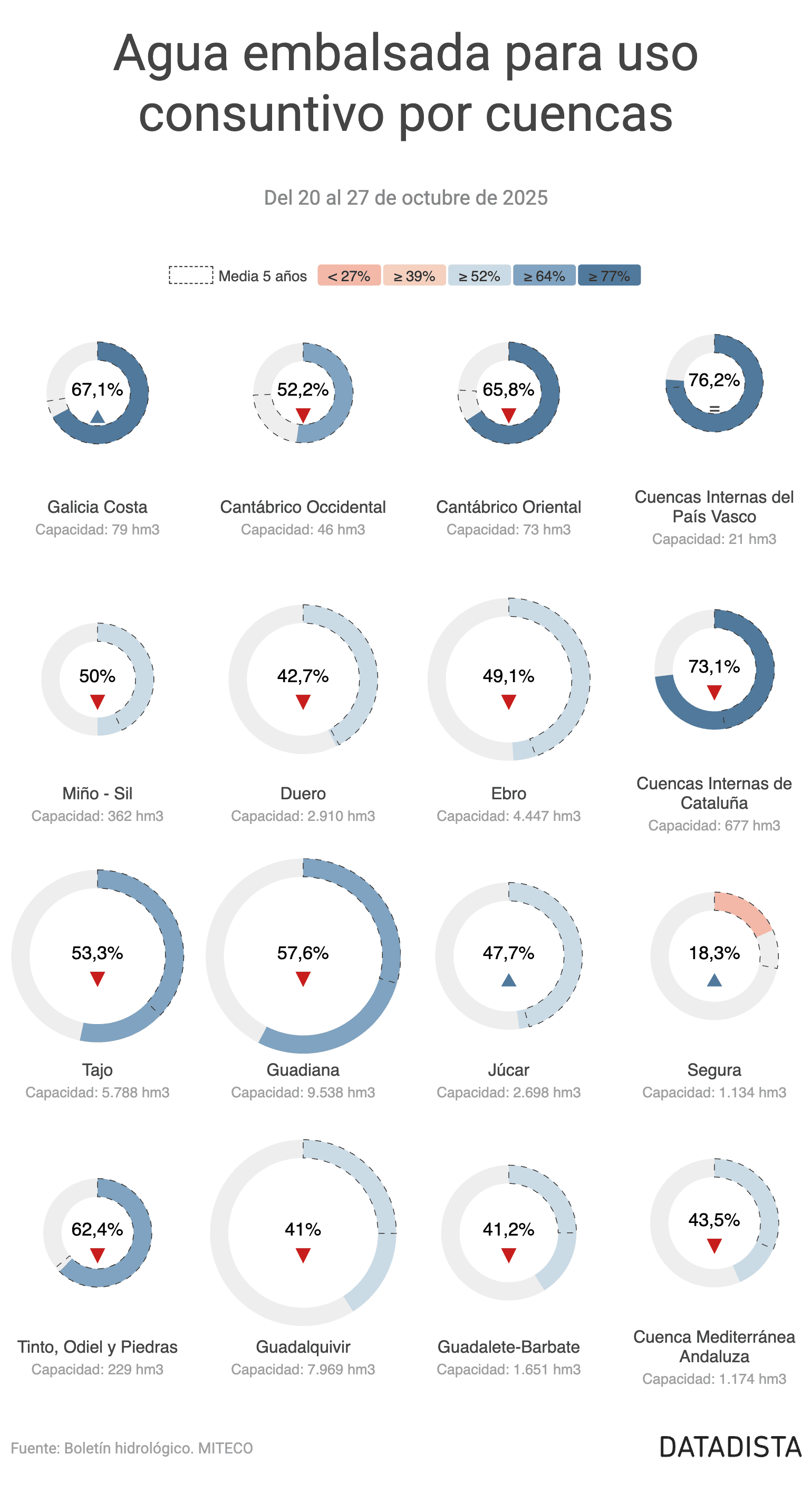 El Cantábrico Occidental encabeza los descensos de las cuencas, cae 4,3 puntos y se sitúa en 52,17% con 24 hm³. Le sigue el Miño-Sil, que pierde 3,3 puntos hasta 50,00% con 181 hm³. El Cantábrico Occidental desciende 1,4 puntos y queda en 65,75% con 48 hm³. Tinto, Odiel y Piedras baja 0,9 puntos hasta 62,45% con 143 hm³. Las Cuencas Internas de Cataluña retroceden 0,9 puntos hasta 73,12% con 495 hm³. La Cuenca Mediterránea Andaluza cae 0,6 puntos hasta 43,53% con 511 hm³. El Duero desciende 0,6 puntos y se sitúa en 42,71% con 1.243 hm³.